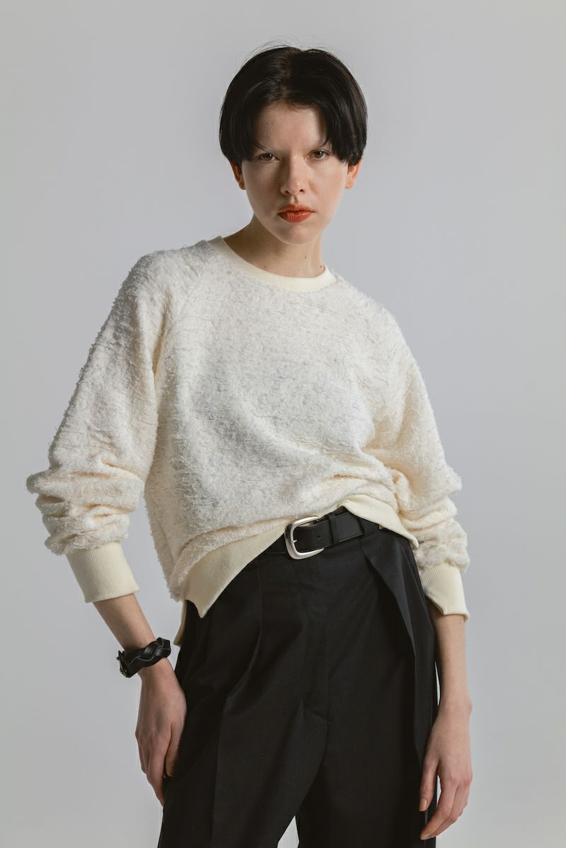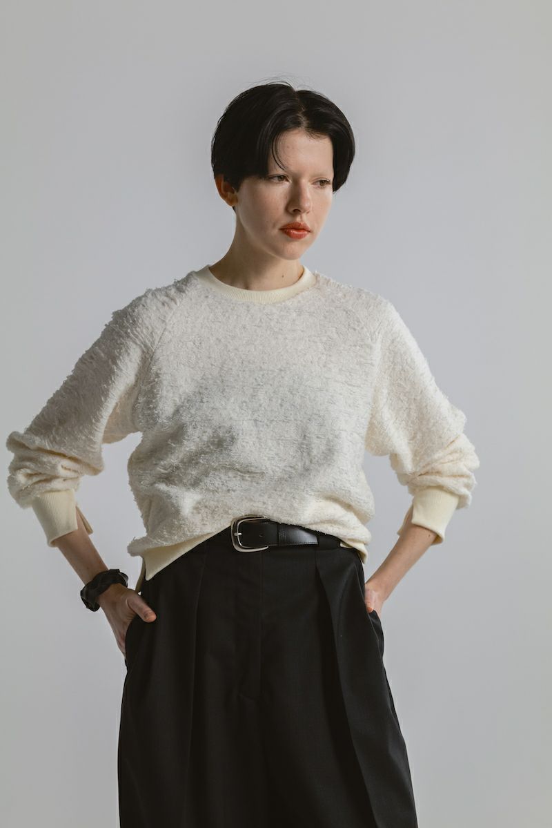 ・シンプルながらも素材感とシルエットで個性を引き立てる一枚