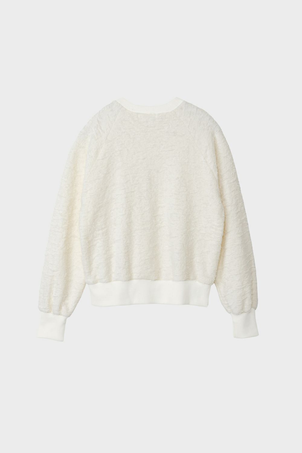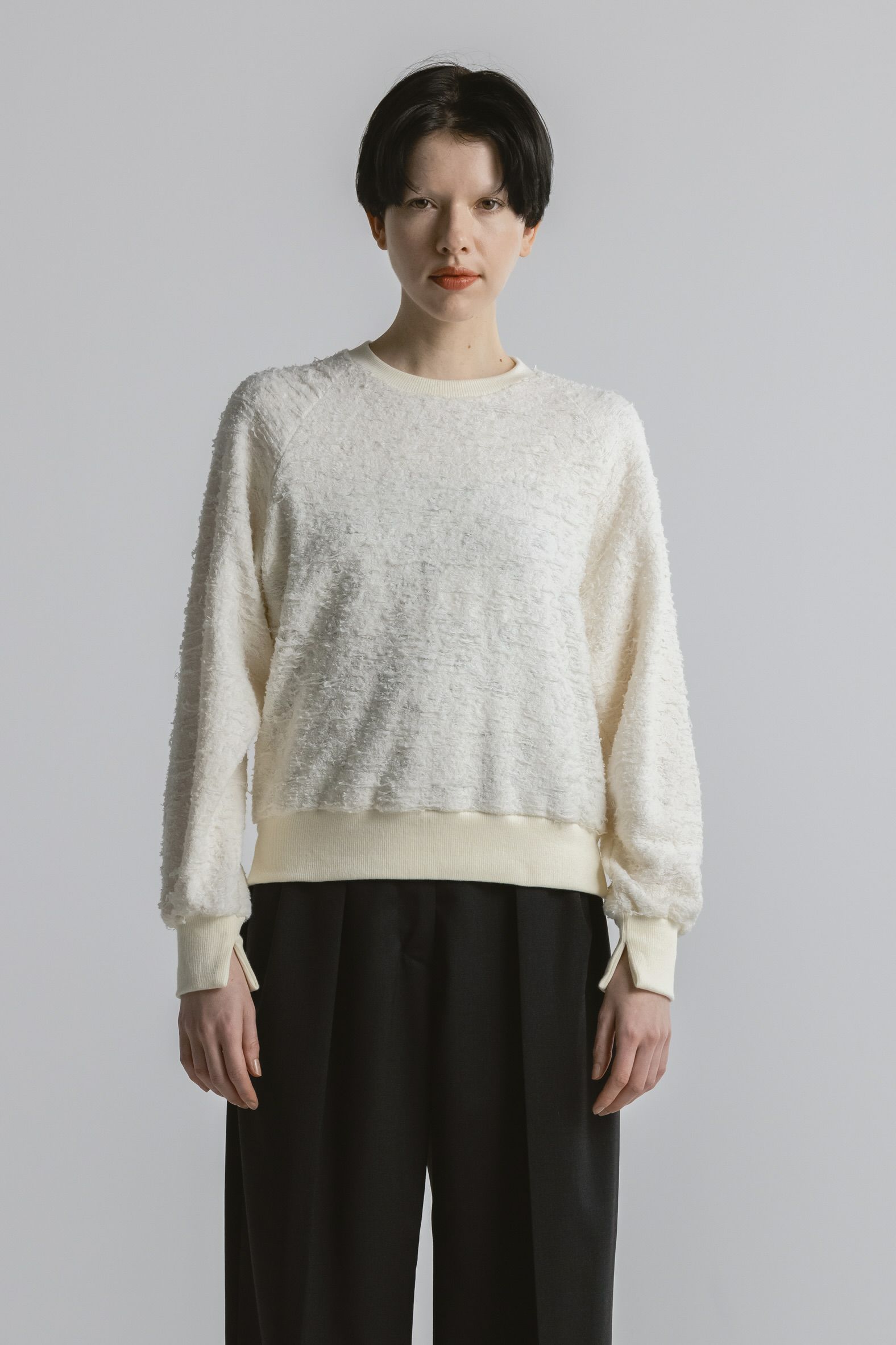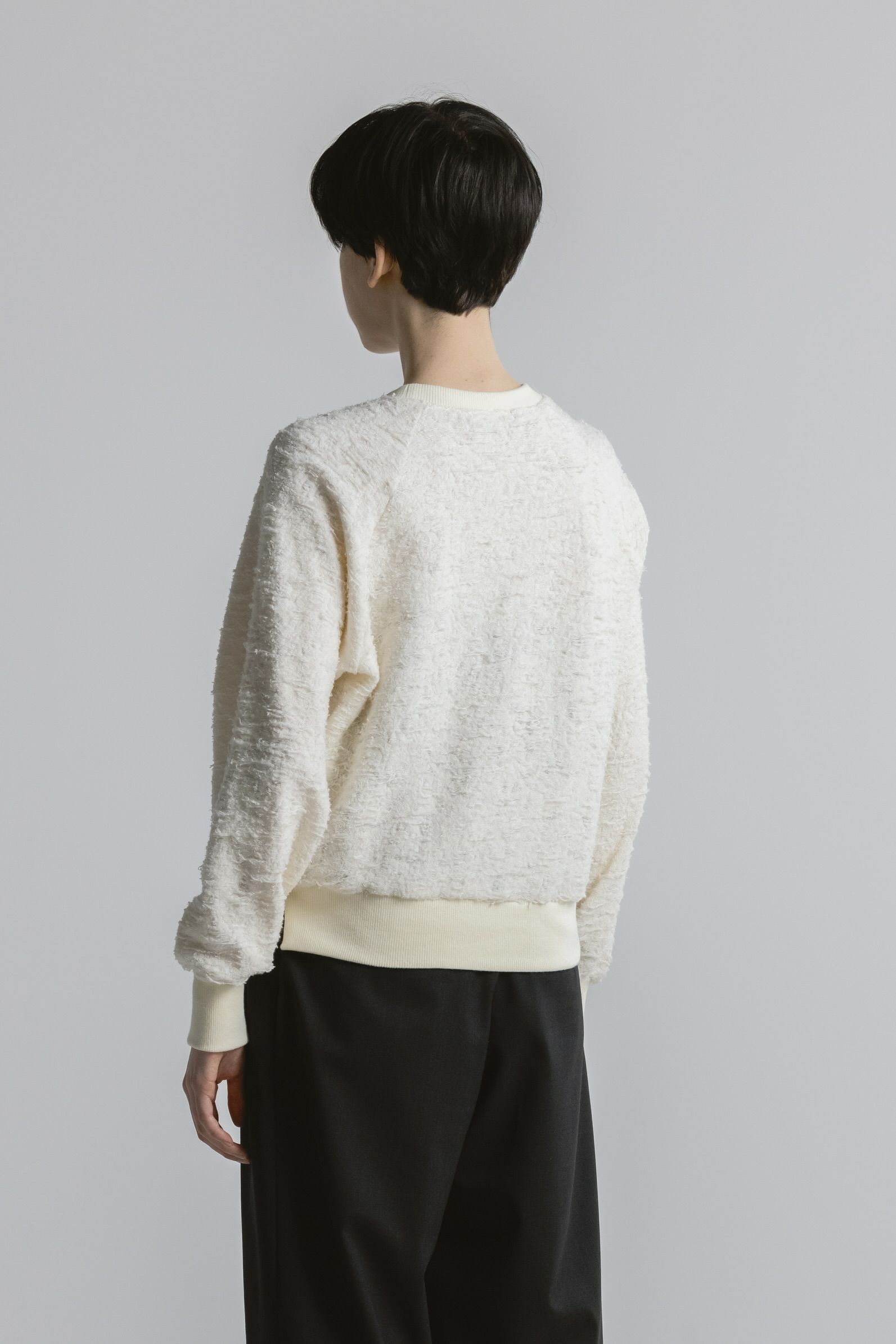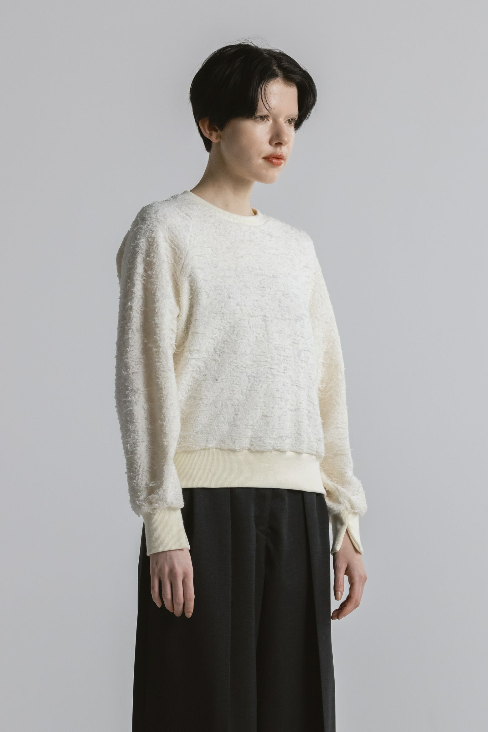 ・ジャカード編機で編み、ところどころに組織を崩すことでダメージ風の表情を演出