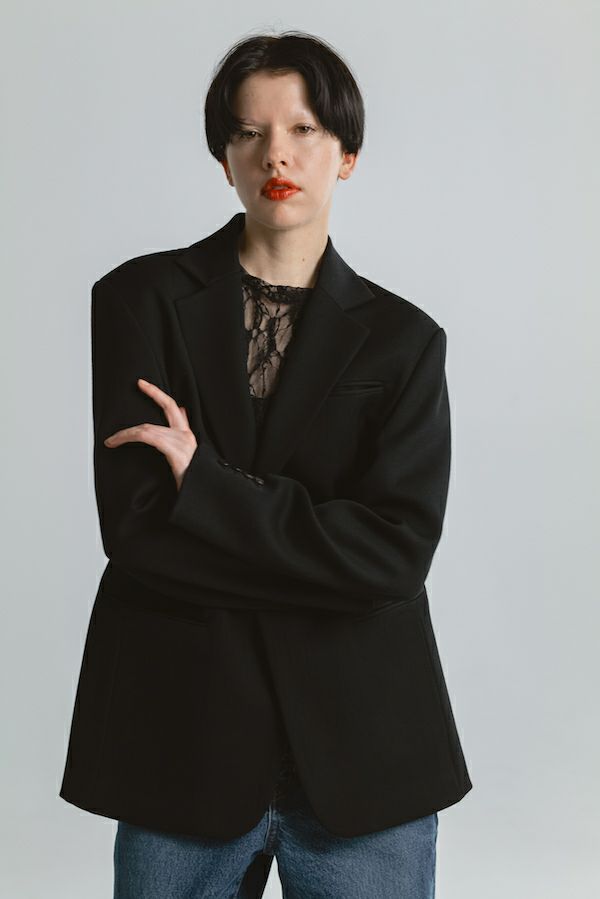肩パッド入りのマニッシュな印象ながら、袖口のボタン位置や背面のボタンディテールなど、細部にこだわりが感じられる一着です。シンプルな中に程よい個性があり、さりげなくスタイリングを引き立ててくれます。