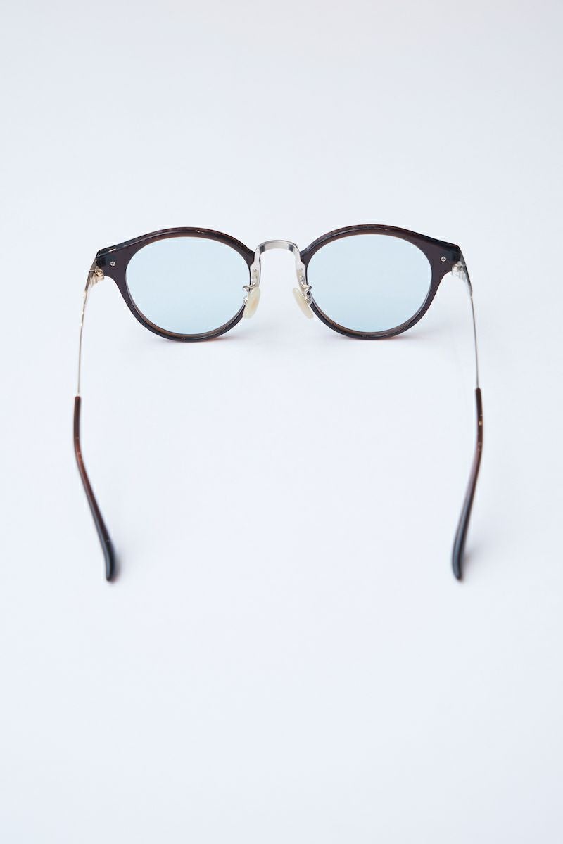 ブリッジ、ヨロイ、テンプルに菖蒲を模した彫金が施されたボストンシェイプのコンビネーションフレーム。