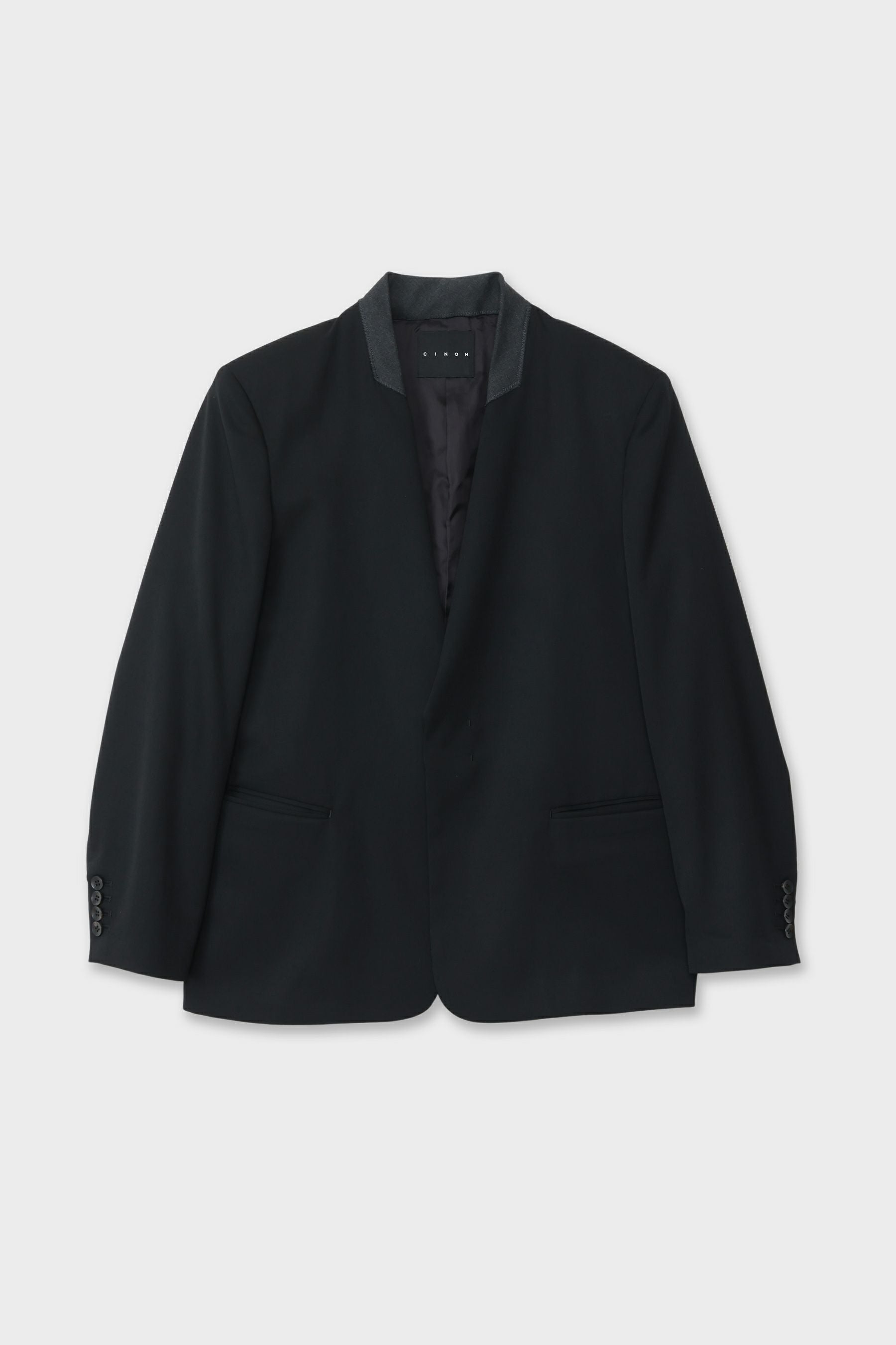 ・本来ジャケットに表情をつける襟とラペルを裏側に折り返し、身頃に厚みをもたせることで、通常のノーカラージャケットとは異なるミニマルな印象に仕上げたデザイン ・前立ては比翼仕立てで、端正かつ静かな存在感を演出