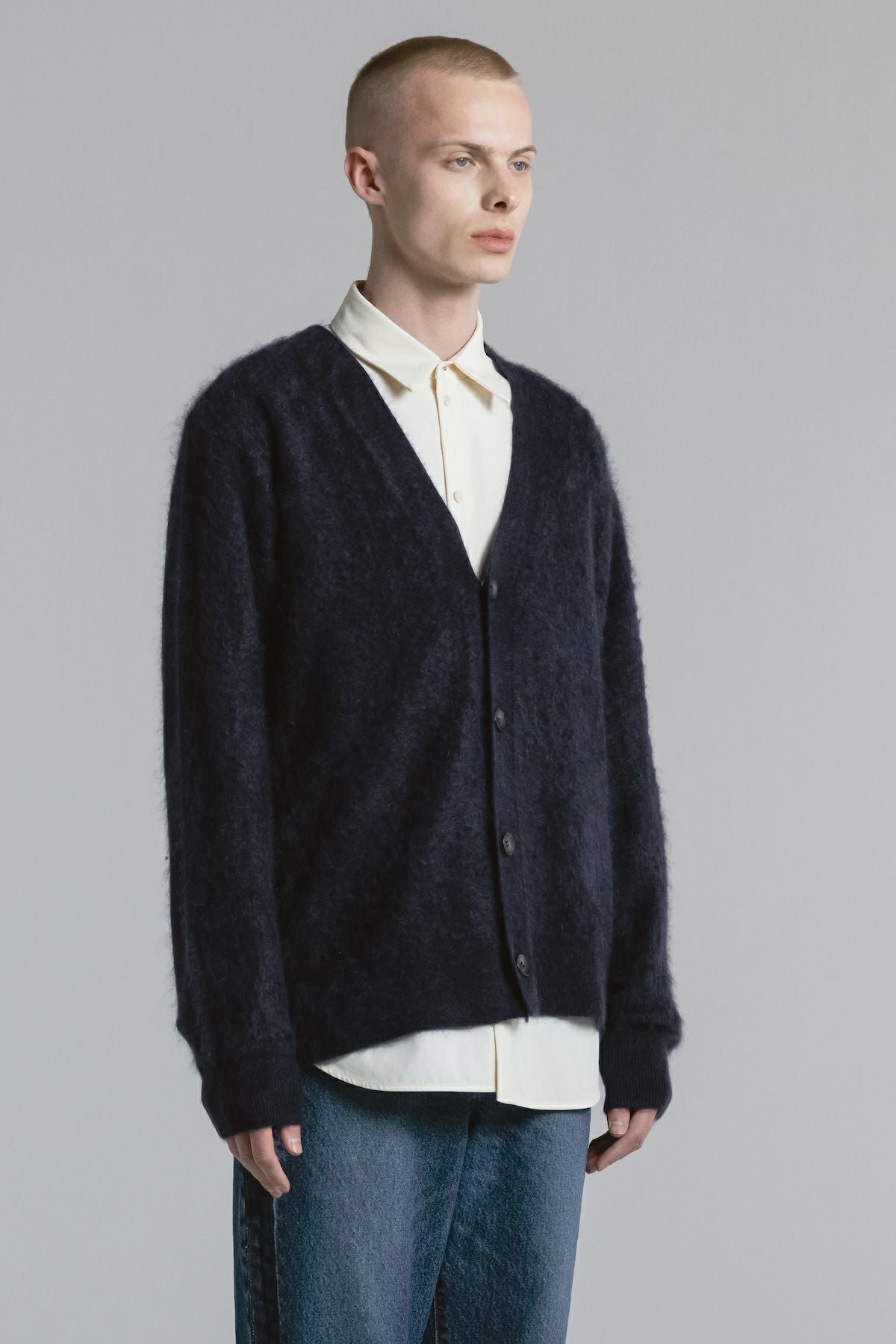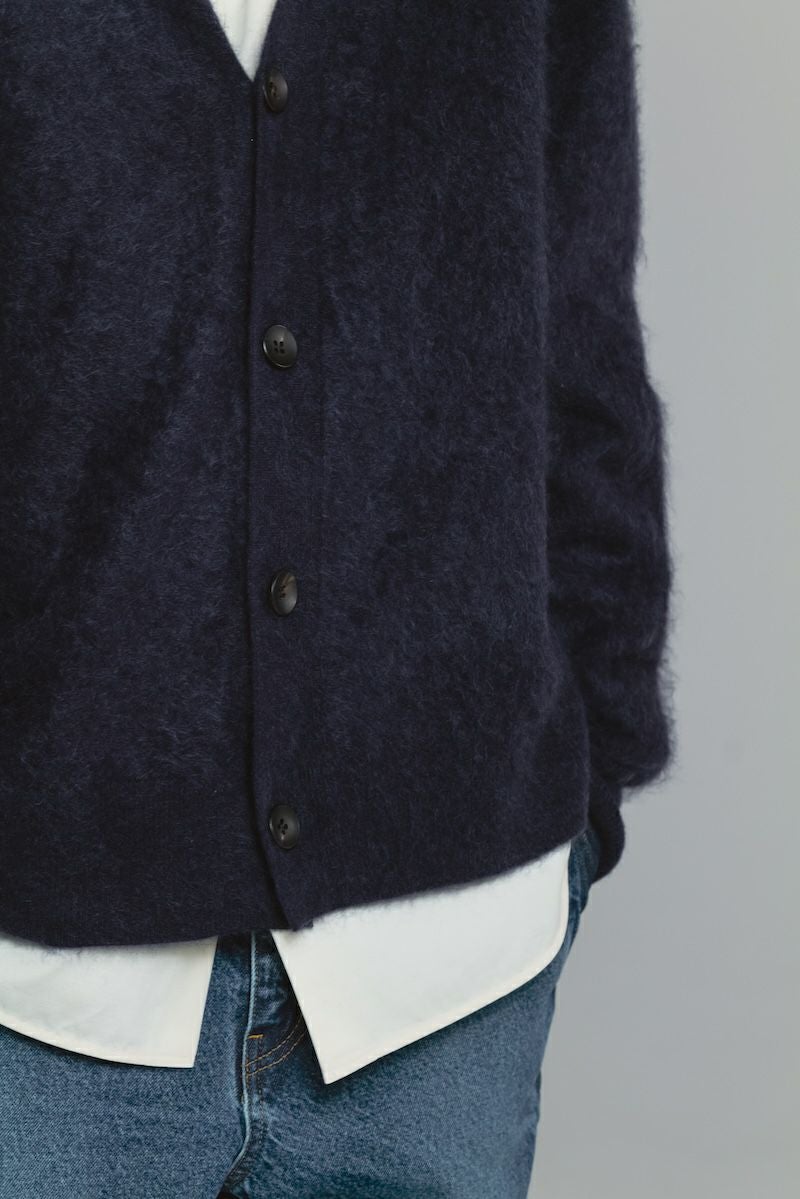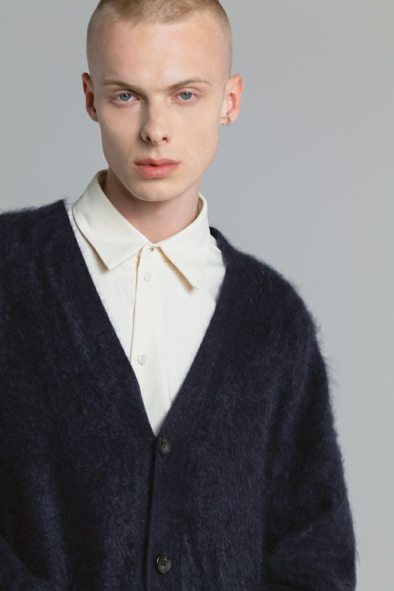 ・ゆったりとしたシルエットのVネックカーディガン ・ミニマルなデザインながらも、素材の高級感が際立つ一着 ・インナーとのレイヤードで表情が変化し、幅広いスタイリングに対応 ・前立てにはマットな質感のボタンを配し、上品さをプラス ・肩の落ちたシルエットが抜け感を演出し、リラックス感のある佇まいに