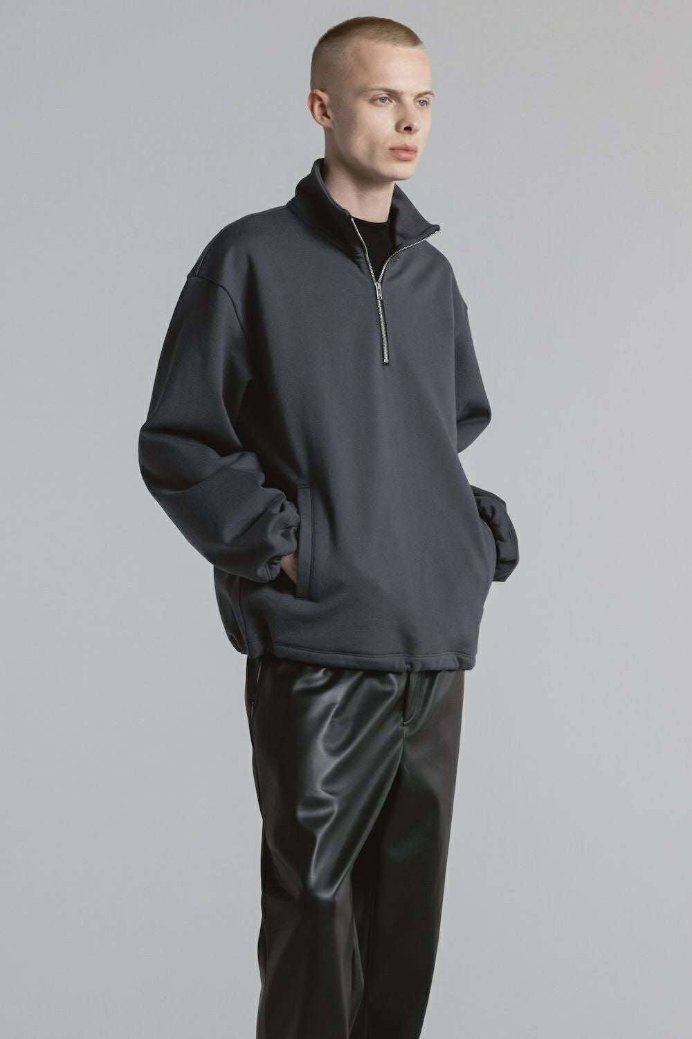 ・ハーフジッププルオーバー ・裾にドローコードを内蔵し、シルエット調整が可能 ・ゆとりあるサイジングながら、素材のハリ感により立体的で洗練された印象に ・サイドポケット付きで利便性も兼ね備えたデザイン ・一枚着としてもアウターインとしても着用可能な、汎用性の高いアイテム