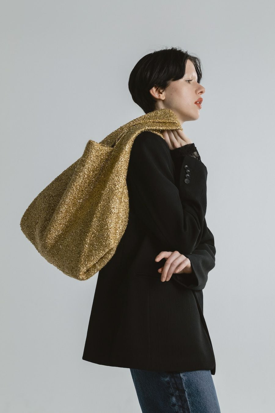 華やかなラメ糸を使用した存在感のあるトートバッグ。