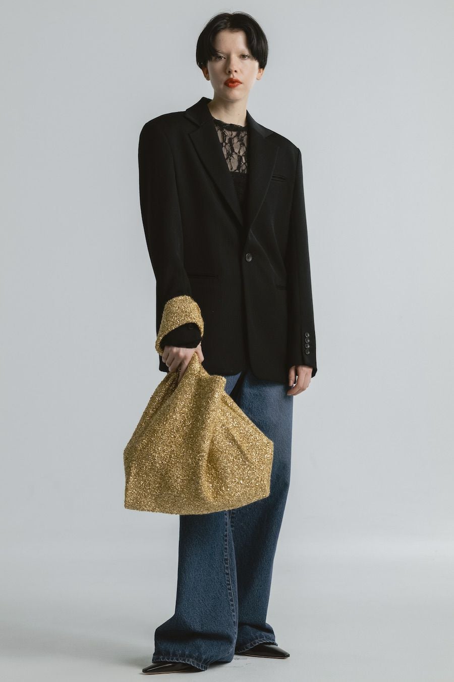 重厚感のある輝きが秋冬のコーディネートに馴染みやすく、裏地付きで安心感のある仕上がり。