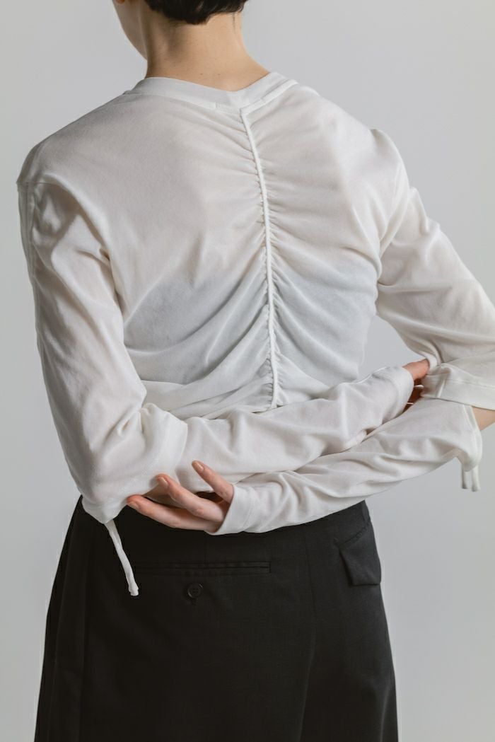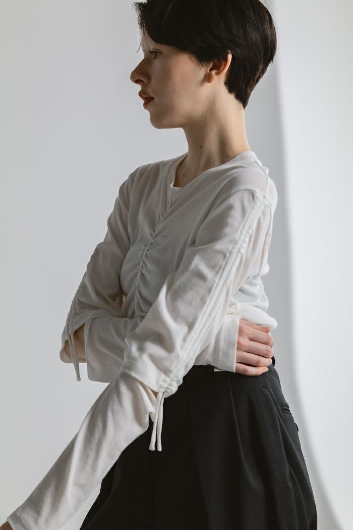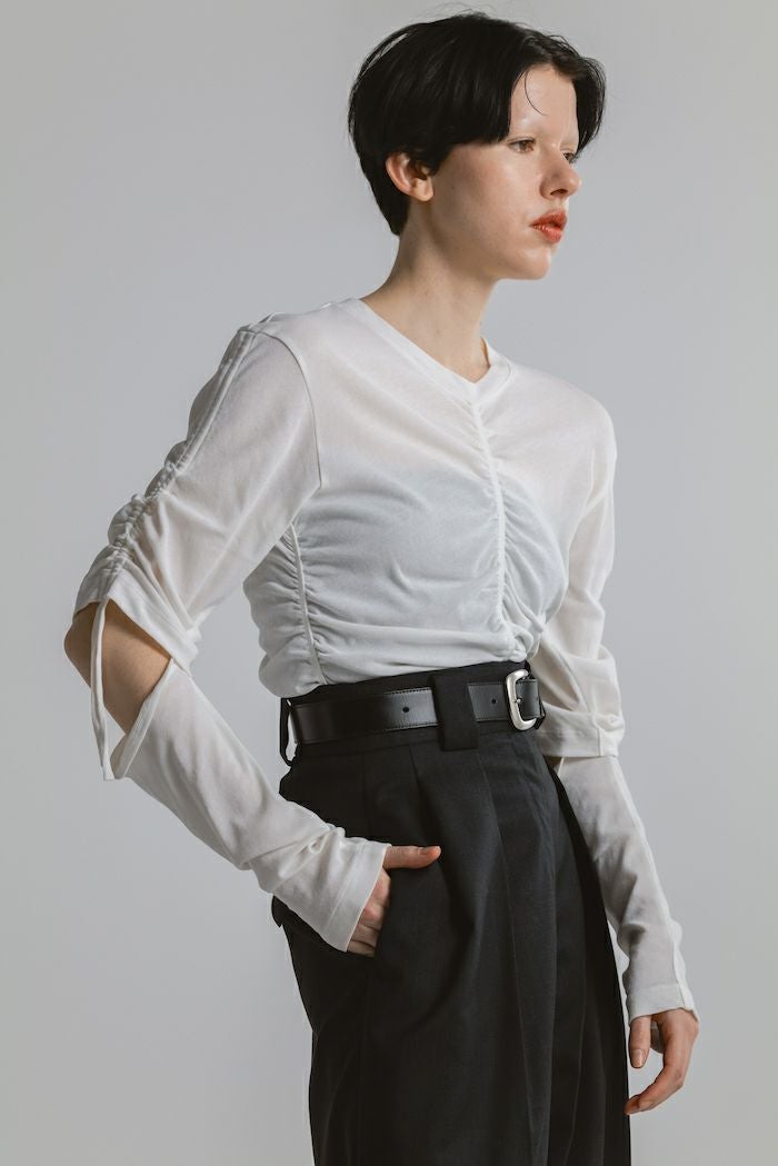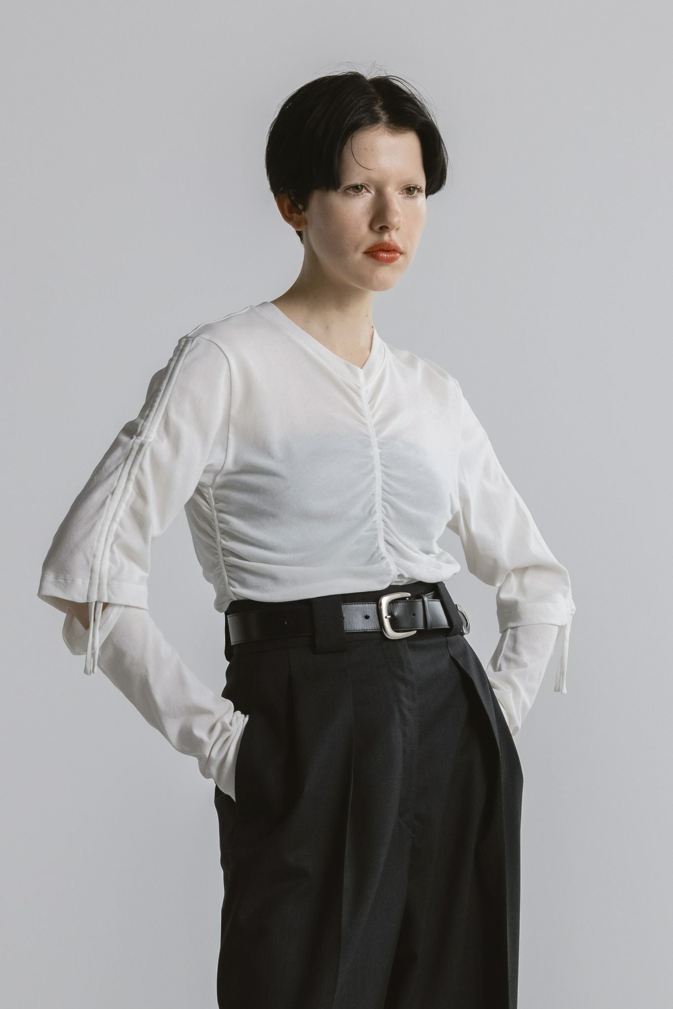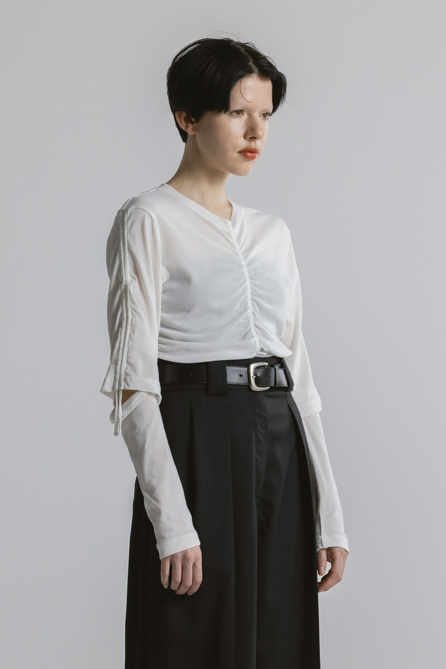 ・肘部分にスラッシュを施し、袖のギャザー分量を調整可能な仕様