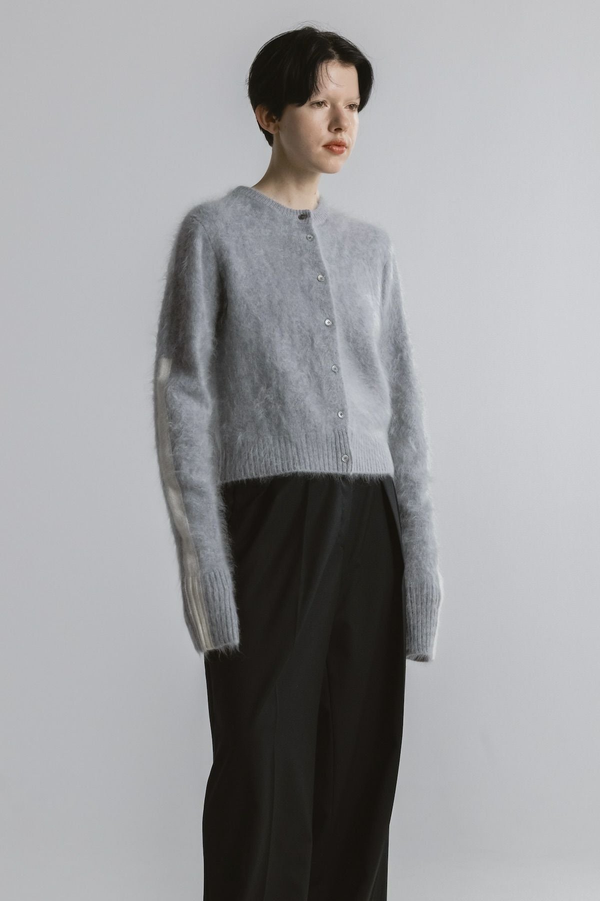 ミンクのようななめらかさと柔らかさをもつカシミヤ糸で編み上げたショート丈のニットカーディガン