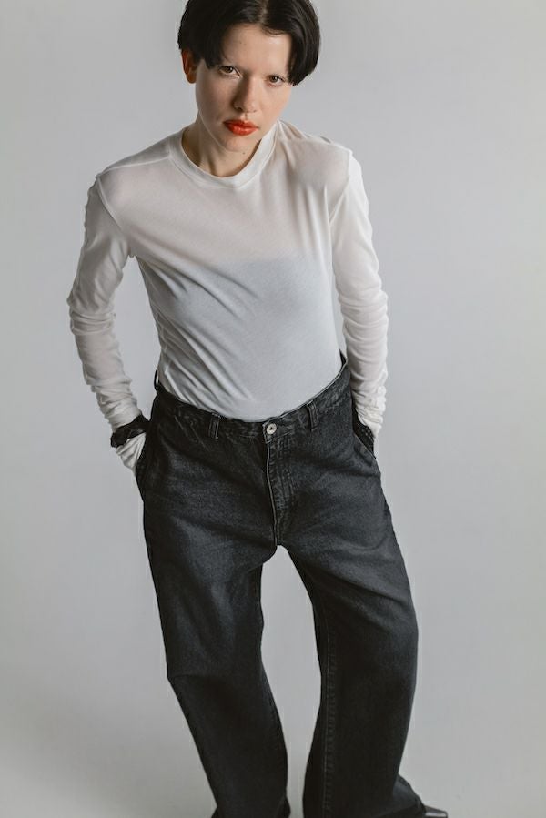 ・14ozのオーガニックコットンデニムを使用 ・しっかりとした厚みがありながら、穿きこむほどに柔らかくなじむ ・環境への配慮とタフさを兼ね備えた、サステナブル素材