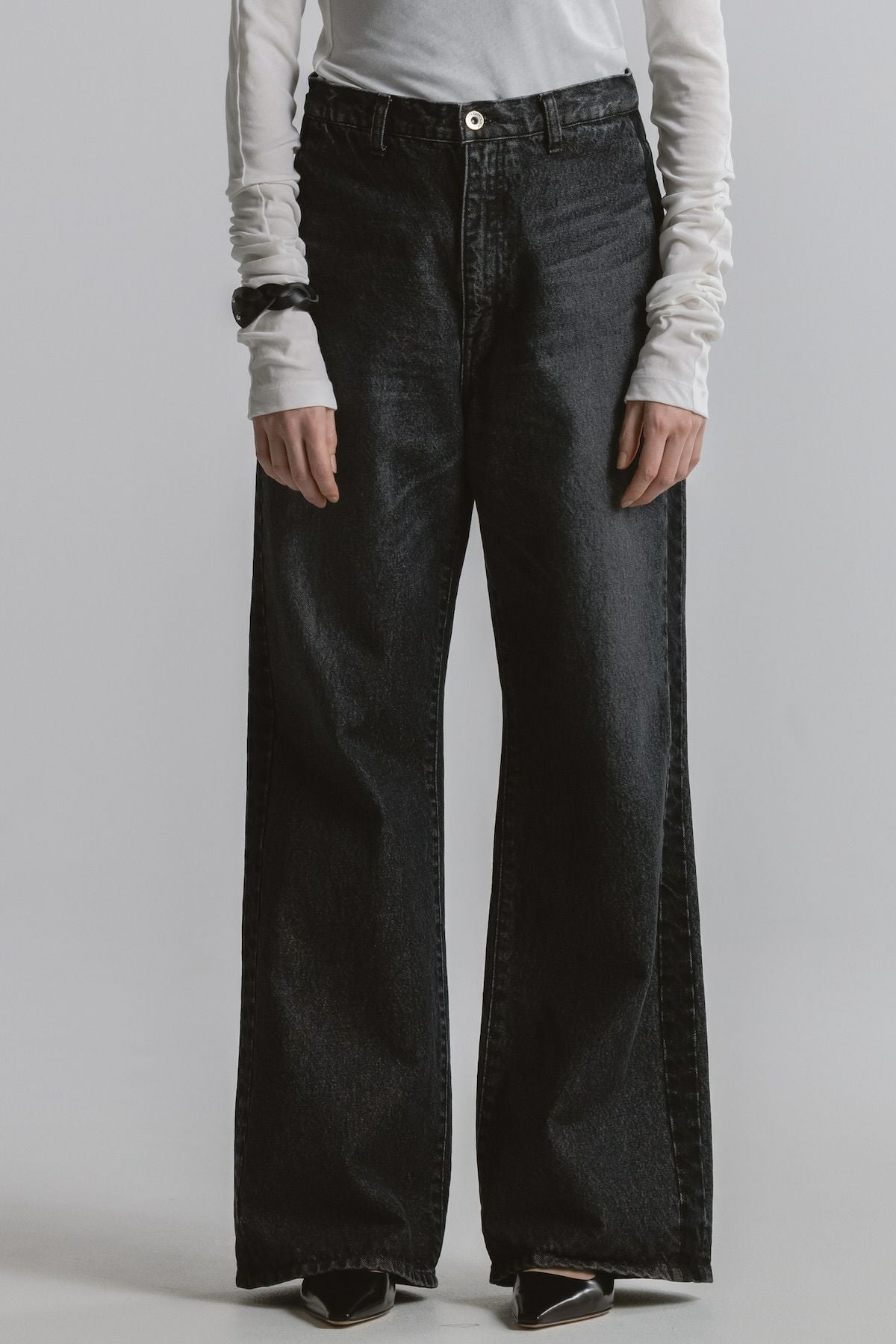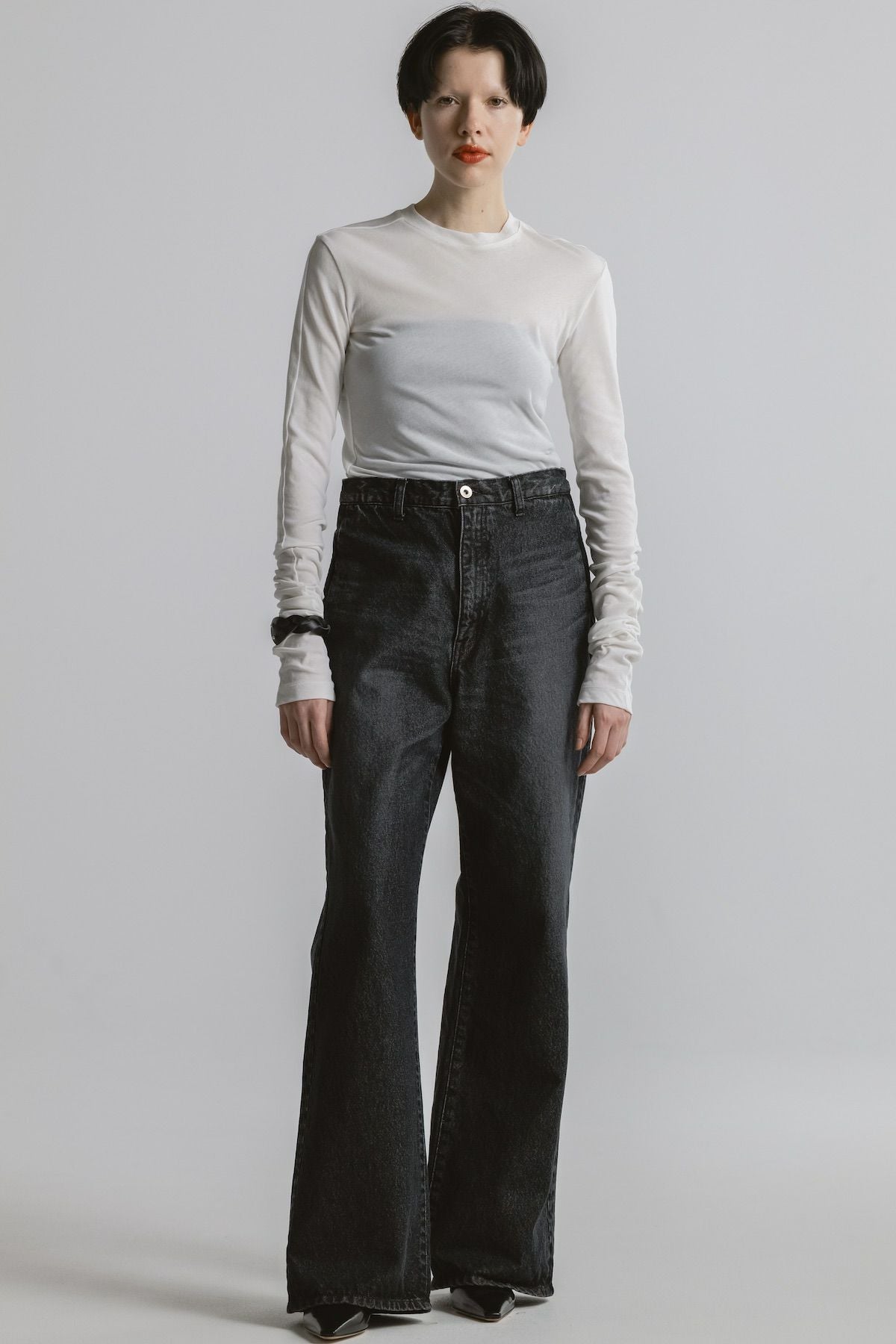 ・美しいラインを描くセミフレアシェイプのデニムパンツ ・脇には側章ディテールを想起させる濃色切り替えを施し、全体にシャープな視覚効果をプラス