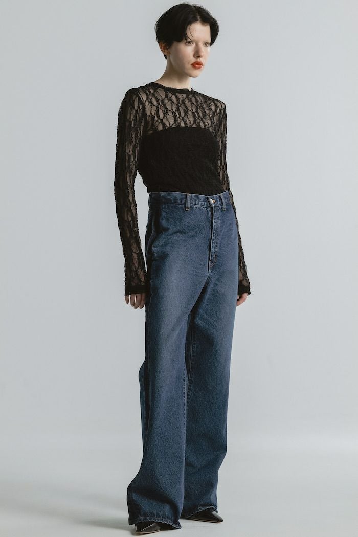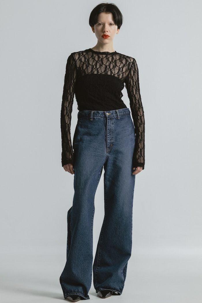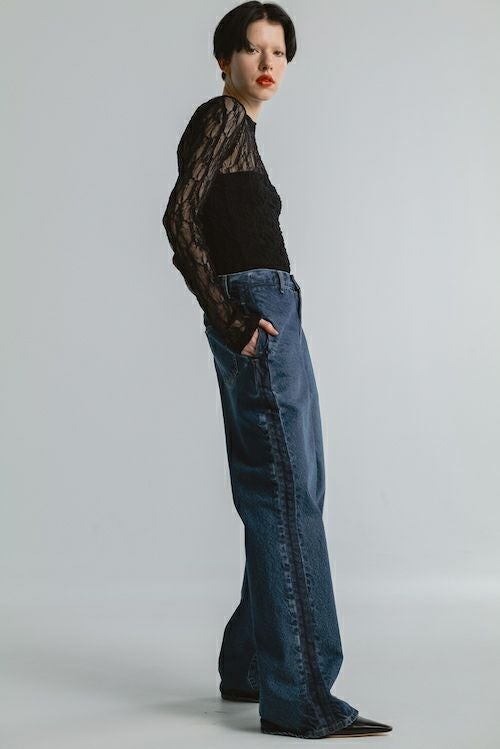 ・美しいラインを描くセミフレアシェイプのデニムパンツ ・脇には側章ディテールを想起させる濃色切り替えを施し、全体にシャープな視覚効果をプラス