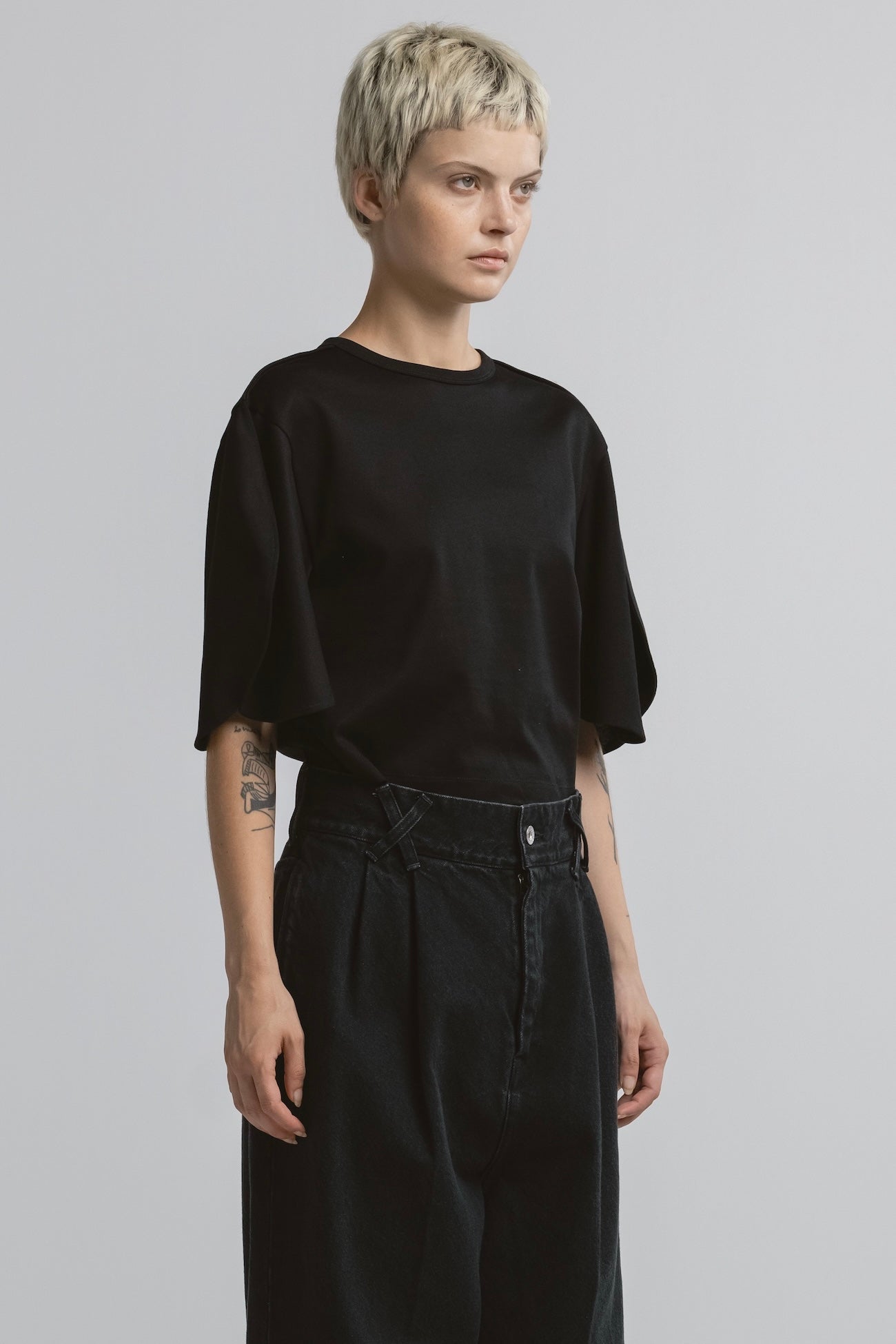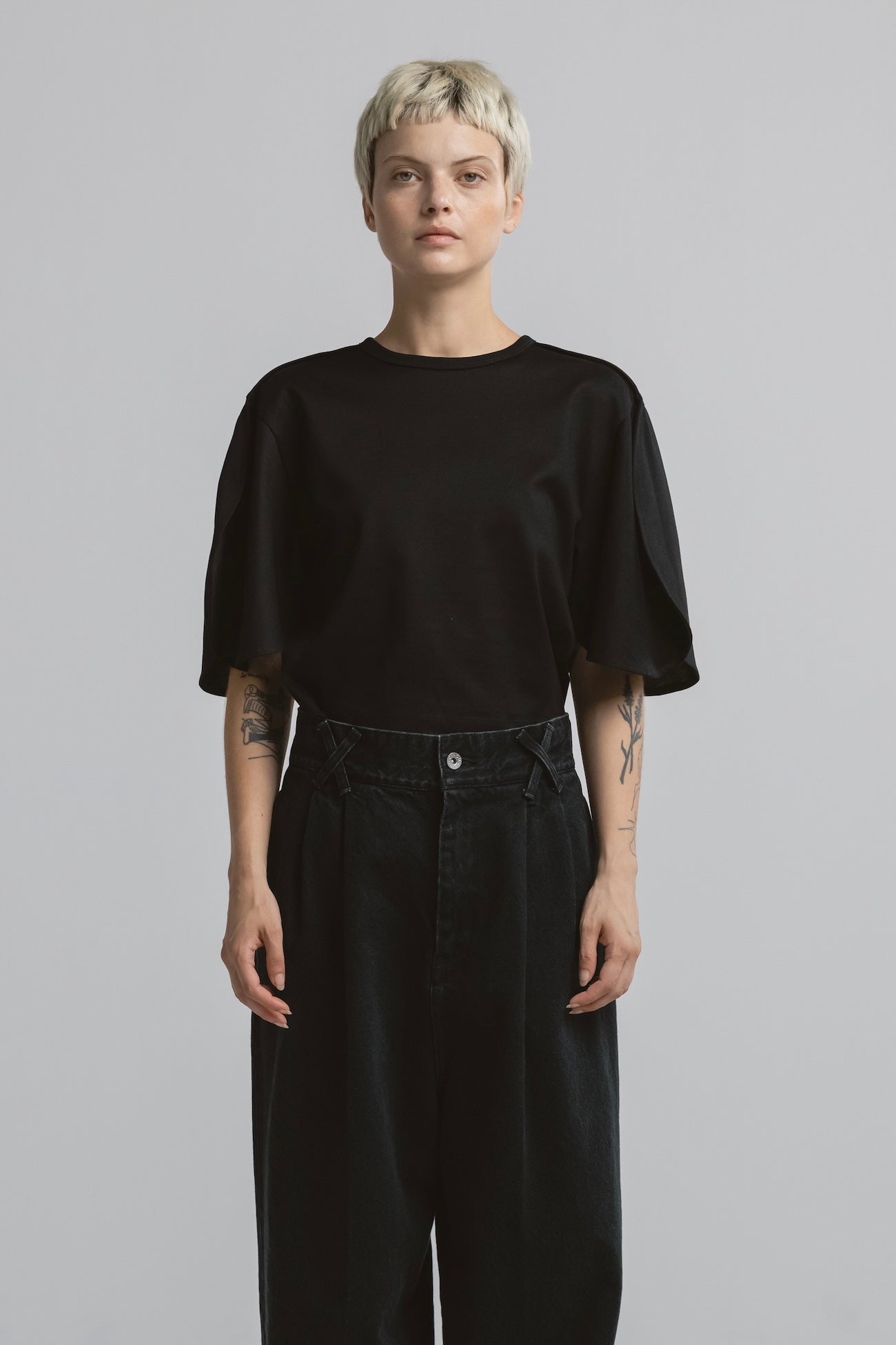 ・丸みのあるパターンで構築された袖が、前後に自然に倒れ込む動きの中でニュアンスを生み出す設計