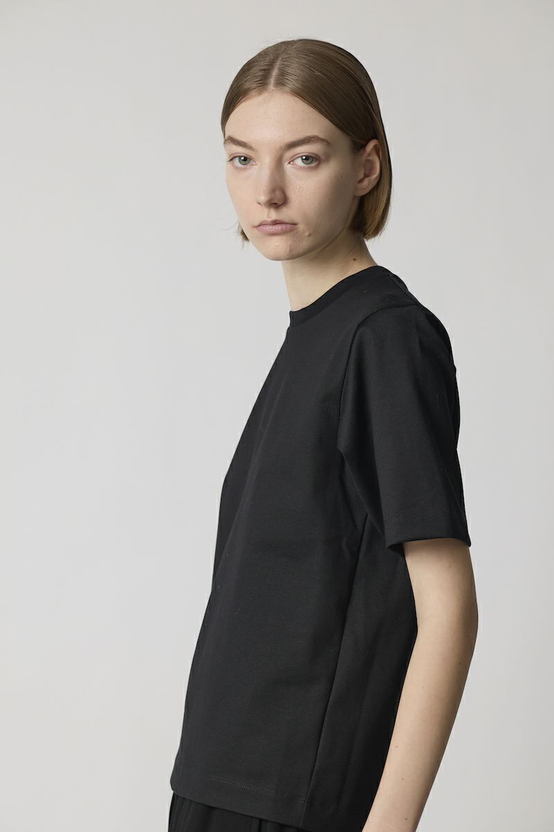 肩幅・身幅ともにジャストなフィット感で、ハリ感とコシのある素材が身体のラインを拾いにくく、1枚でサマになるきれいめTシャツです。