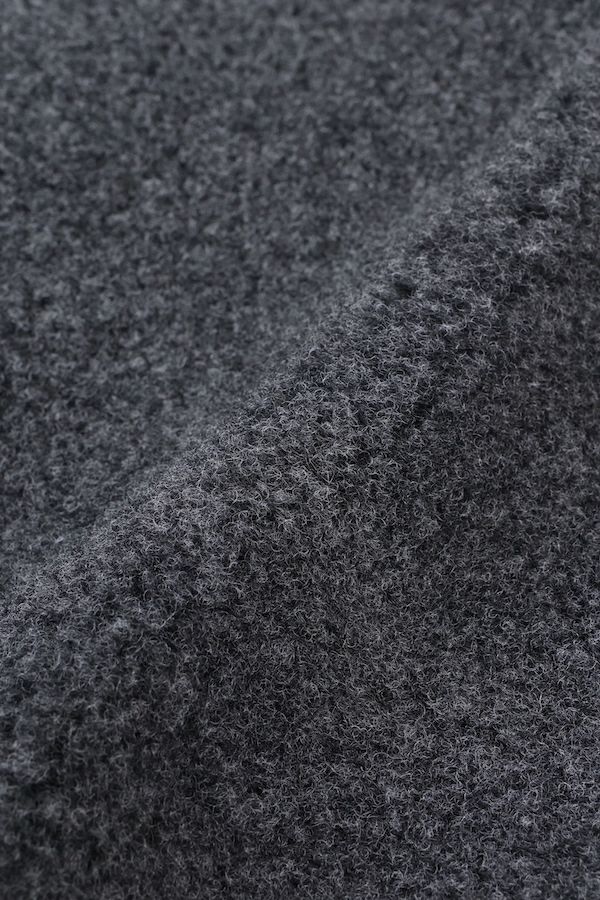 ウール・ポリエステルのスライバー(撚りののないわた状の糸)を編み込むことでもこもことしたボリューム感を表現しています。
