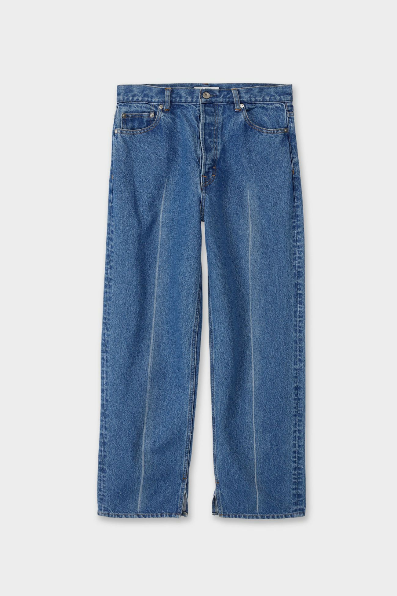 スラックスのセンタークリースを模した加工を施したレギュラーフィットのデニムパンツです。 裾にはベンツを施し、控えめに広がるシェイプとなっています。 フロントは身体に馴染むボタンフライ仕様となっています。
