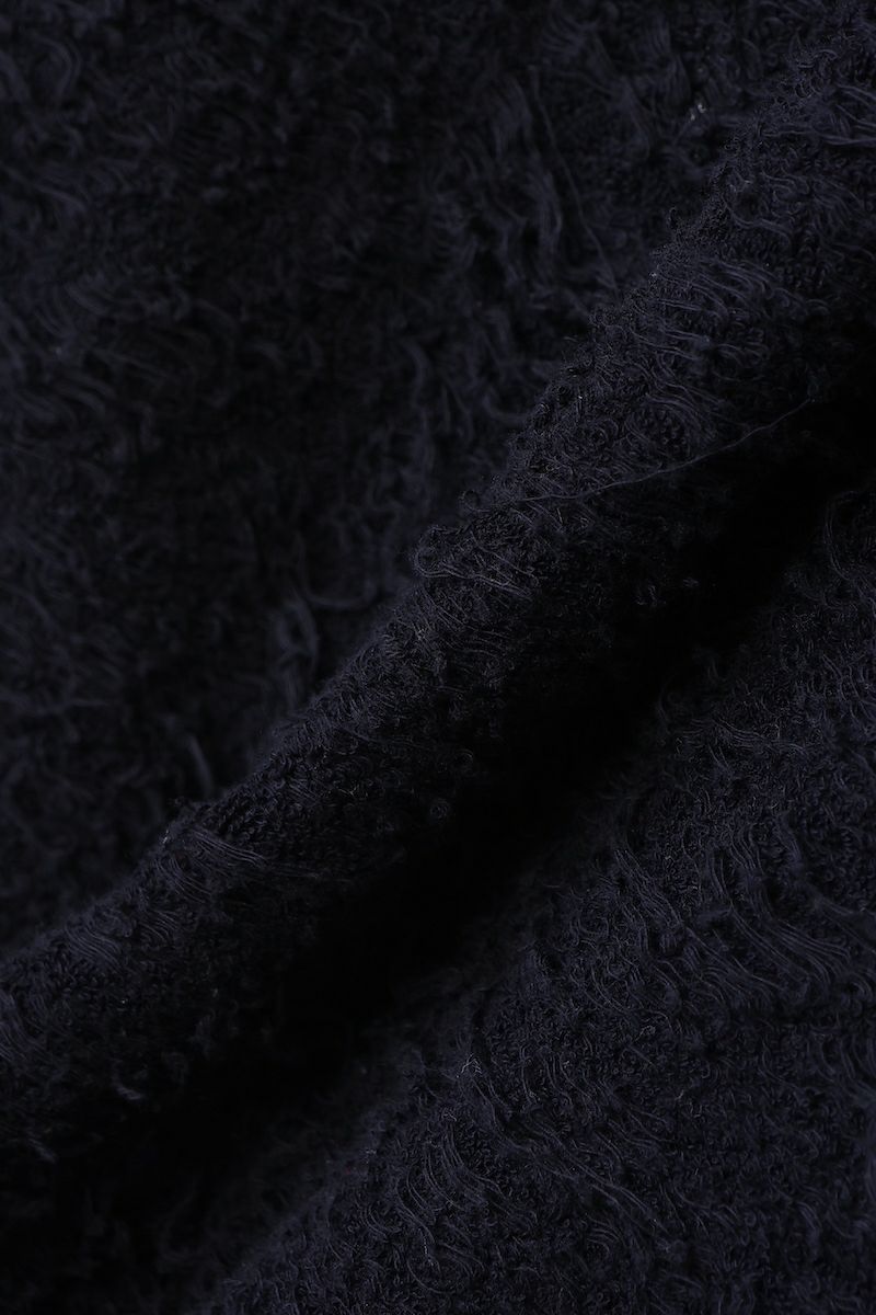 ・ジャカード編機で編み、ところどころに組織を崩すことでダメージ風の表情を演出