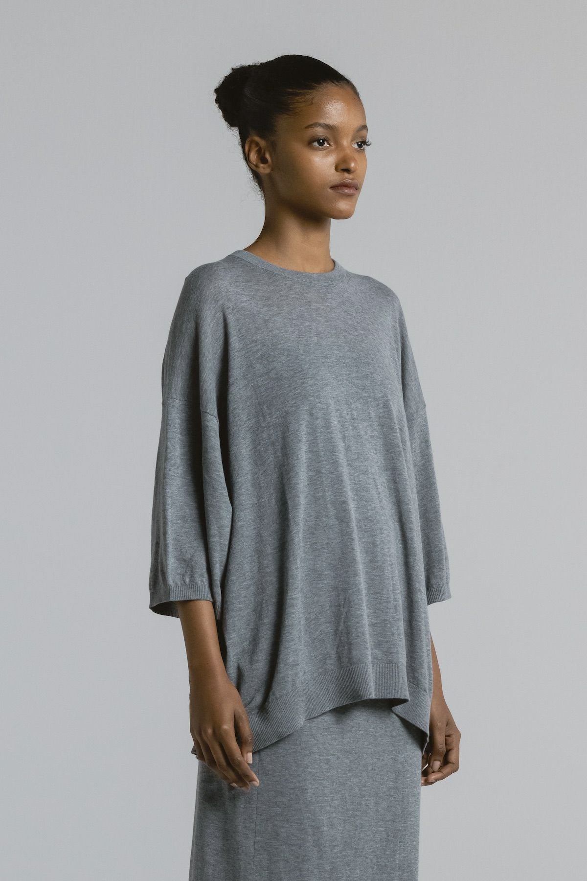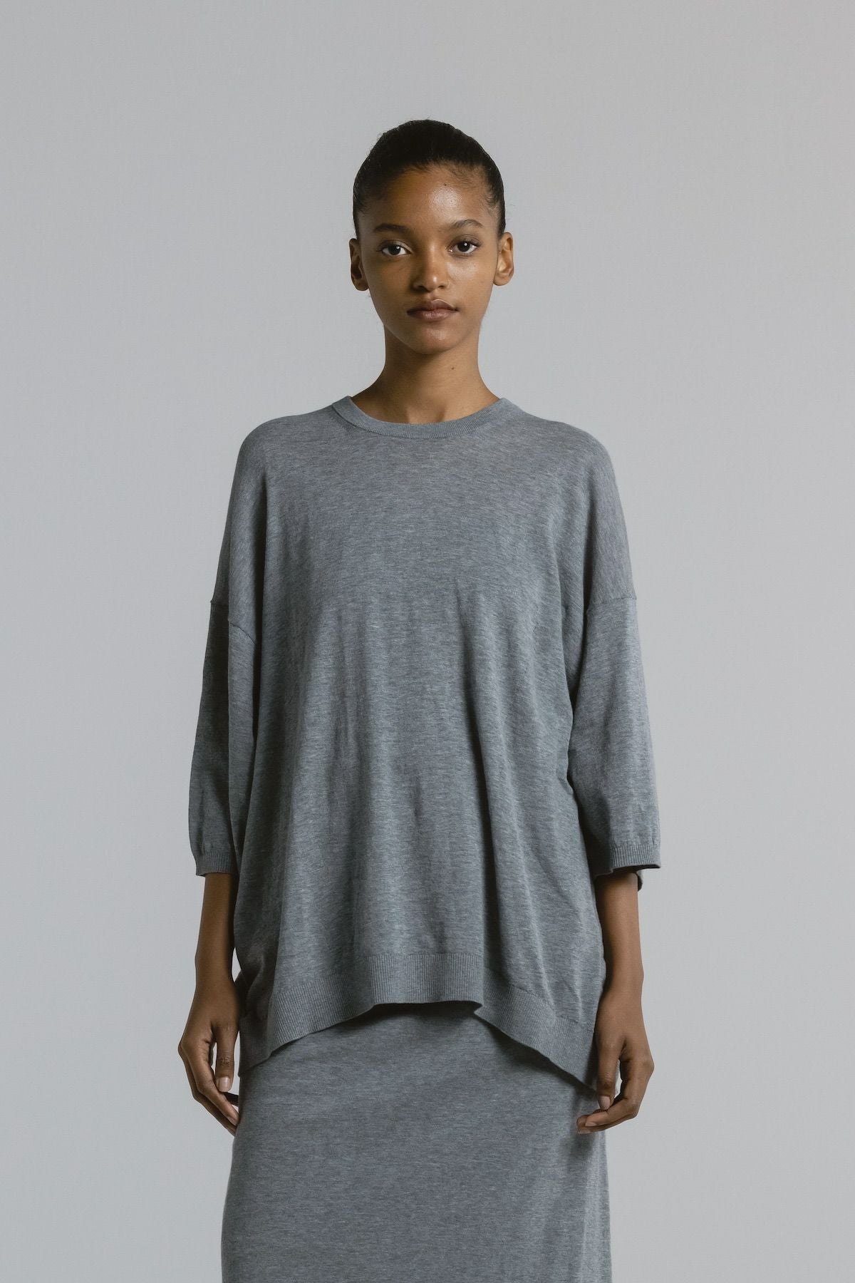 Tシャツ感覚でデニムなどのカジュアルなボトムと合わせても相性抜群ですが、同素材のスカート(SK007)やPINTUCK PANTS(PT011)と合わせて、少しエレガントにまとめたスタイリングもおすすめ。シーンに応じて表情を変えられる、汎用性の高い一枚です。