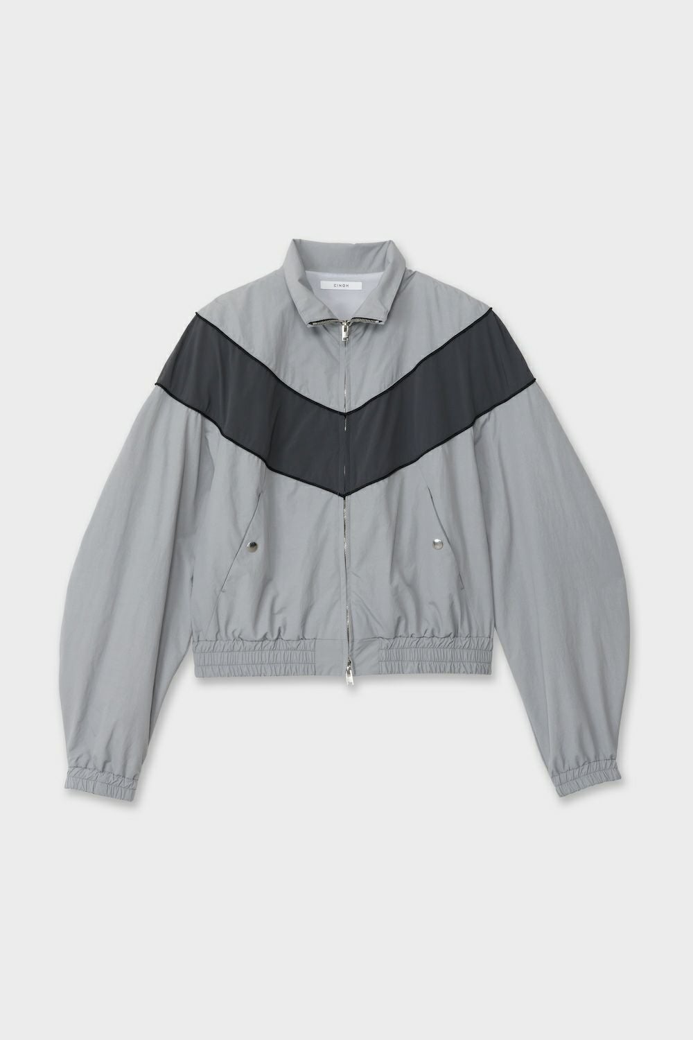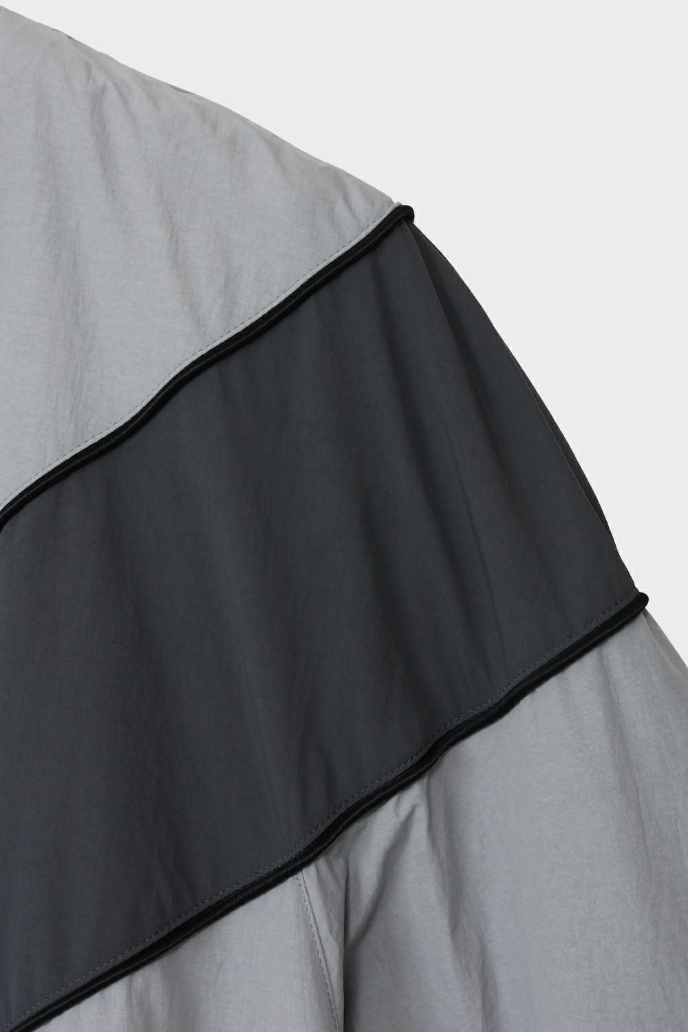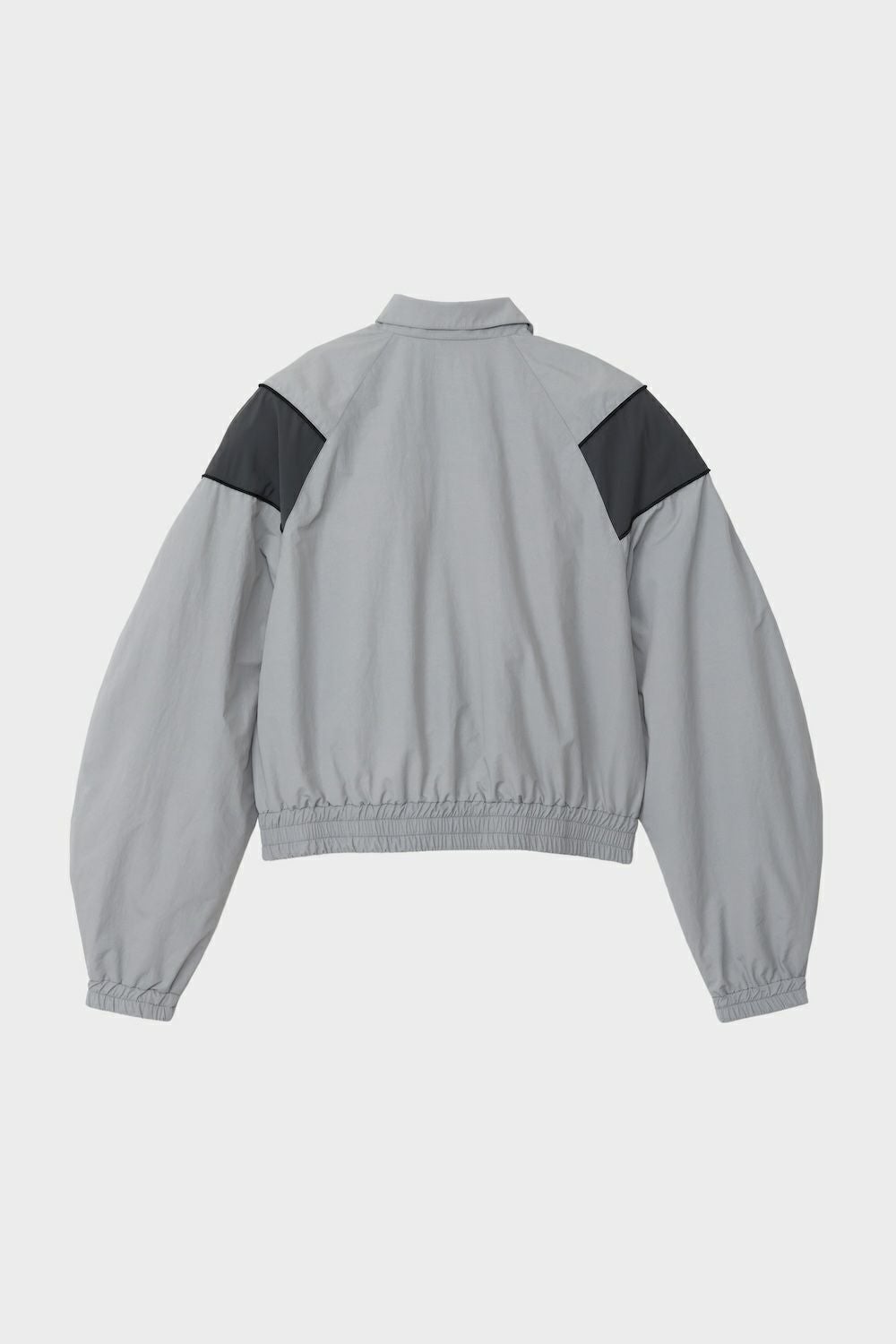 ・円相をモチーフとした立体感のあるトラックジャケット ・肩から袖にかけての曲線パターンが特徴 ・肩パッドを加えることで構造的な存在感を演出 ・平面的になりがちなナイロン素材に構築的な印象をプラス
