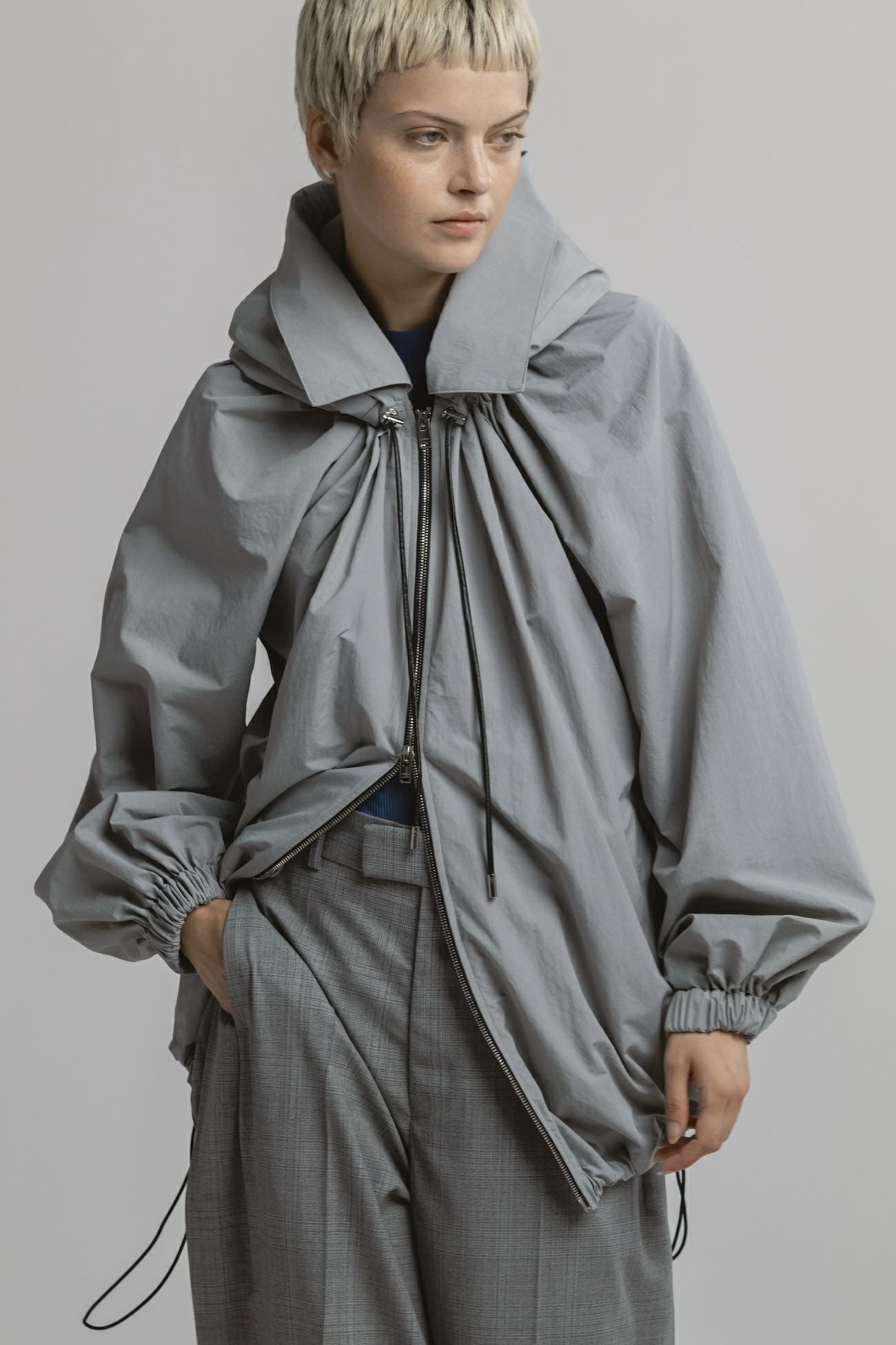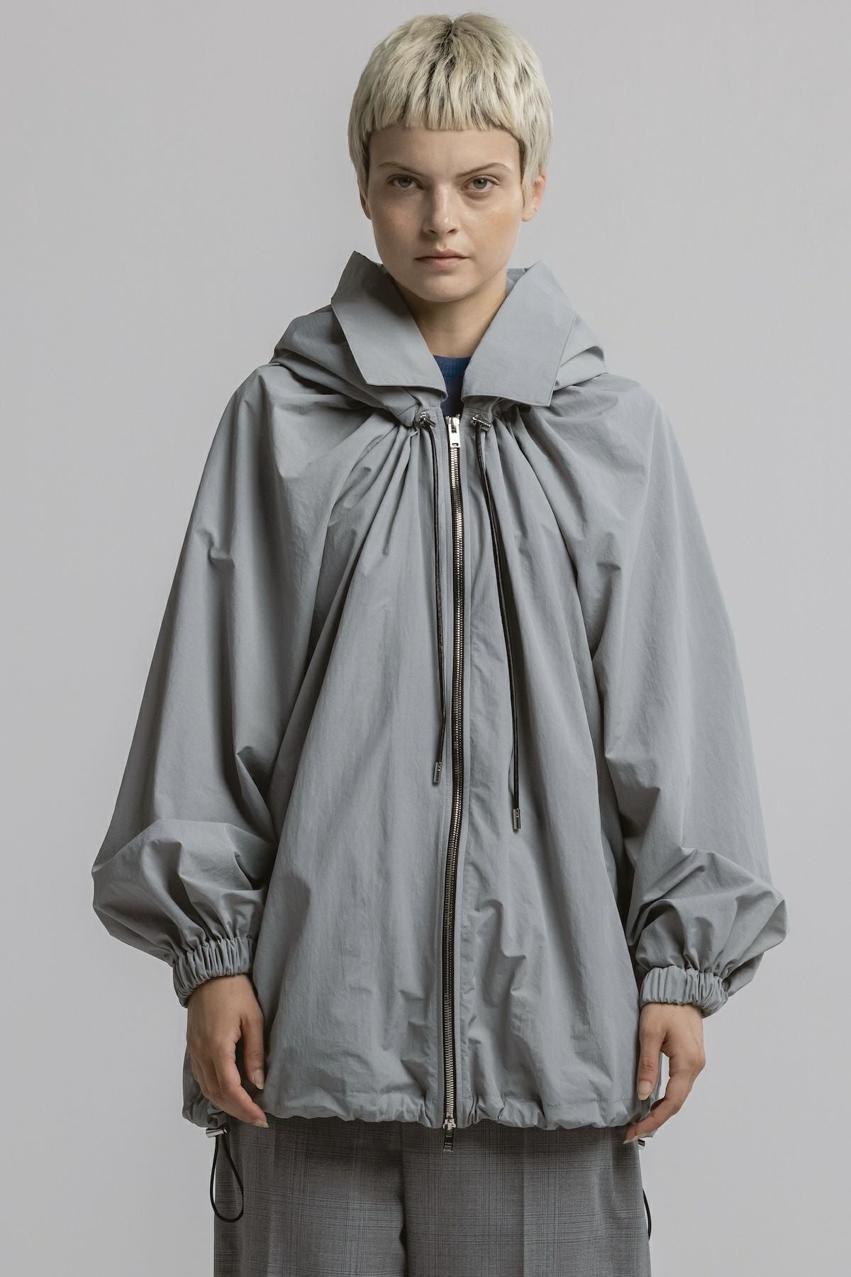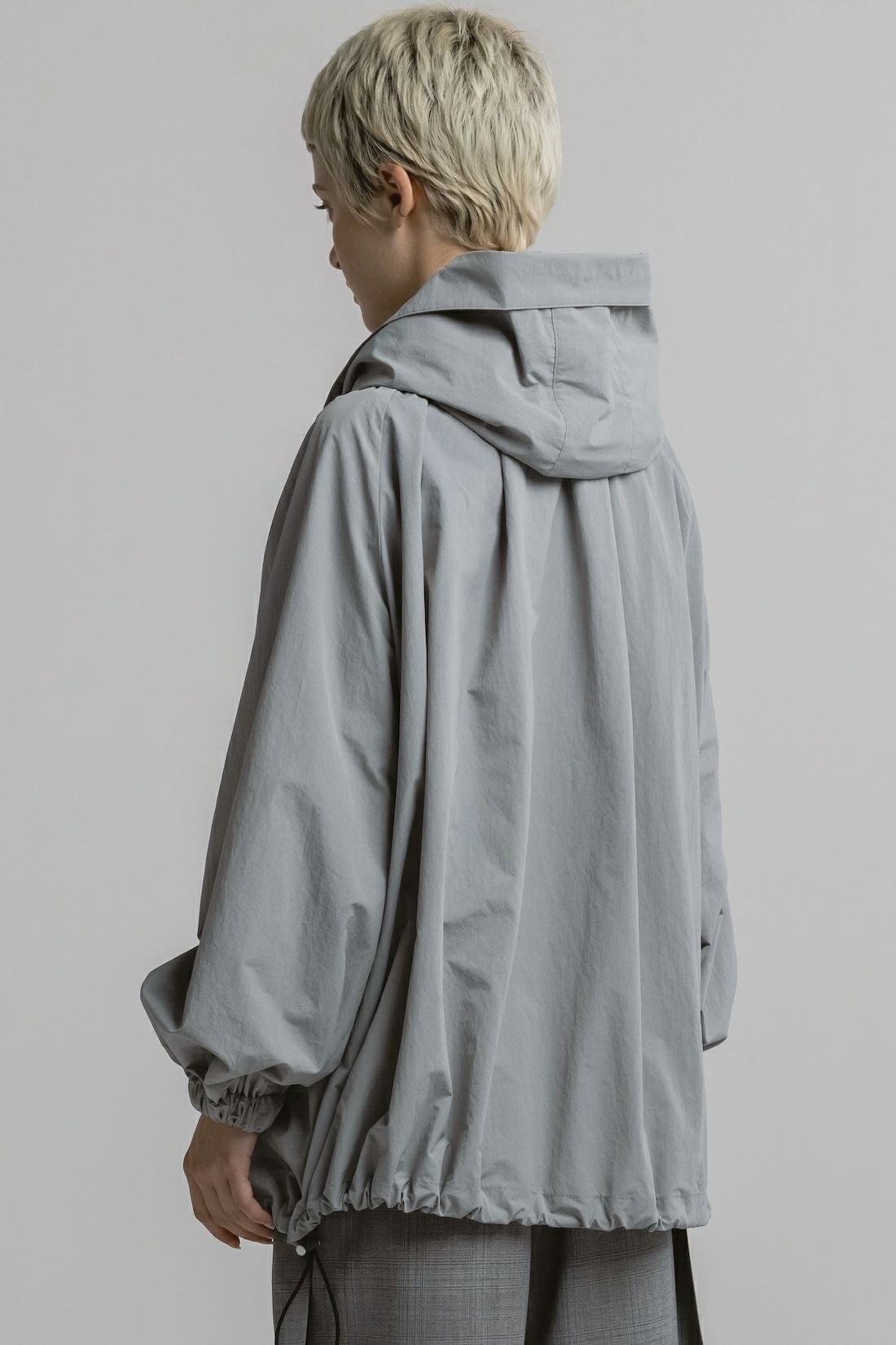 ・ボリューム感のあるシルエットのナイロンフーディブルゾン ・襟ぐりと裾にはドローコード付きでシルエット調整が可能 ・フロントのドローコードで生まれるドレープがエレガントな印象 ・フード口にはハリ感のあるディテールを加え、華やかさを演出 ・立体感ある襟元で、カジュアルと上品さを両立したデザイン