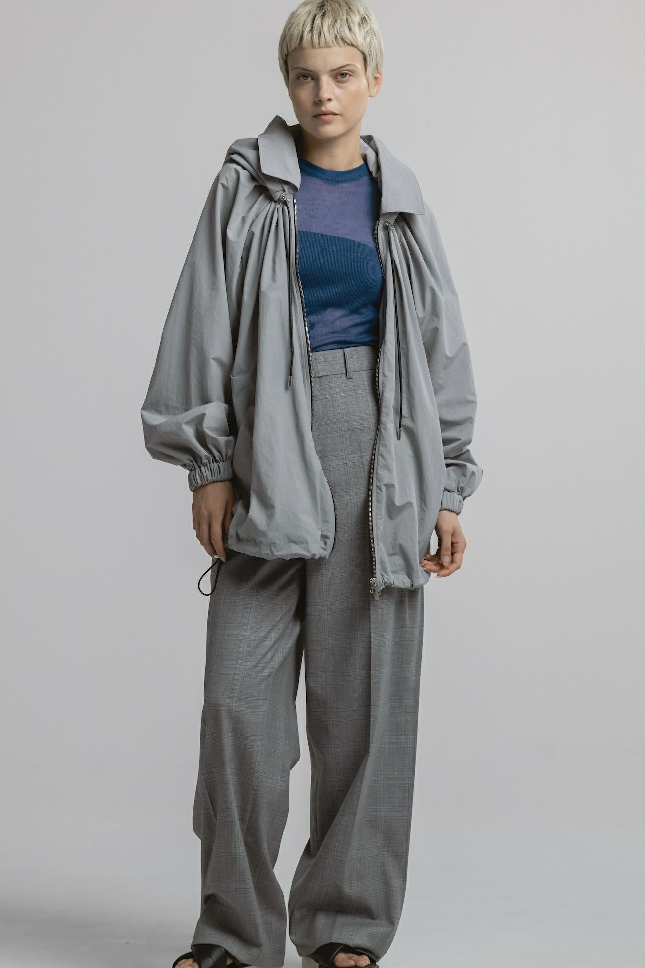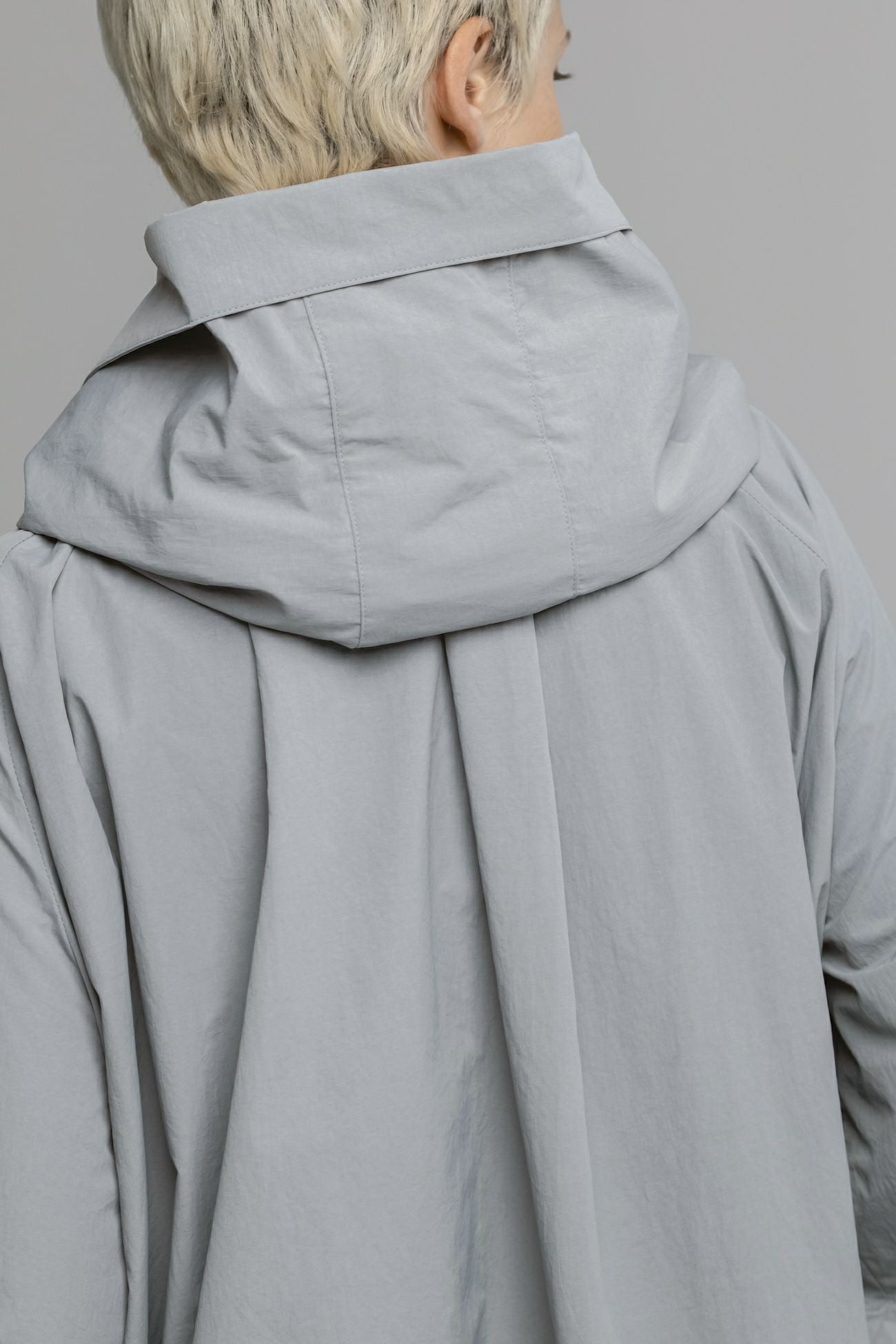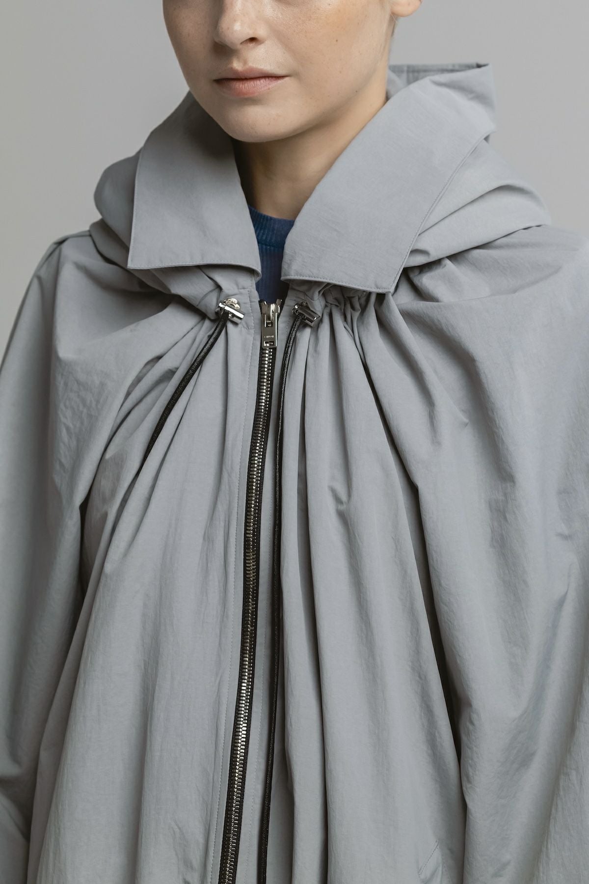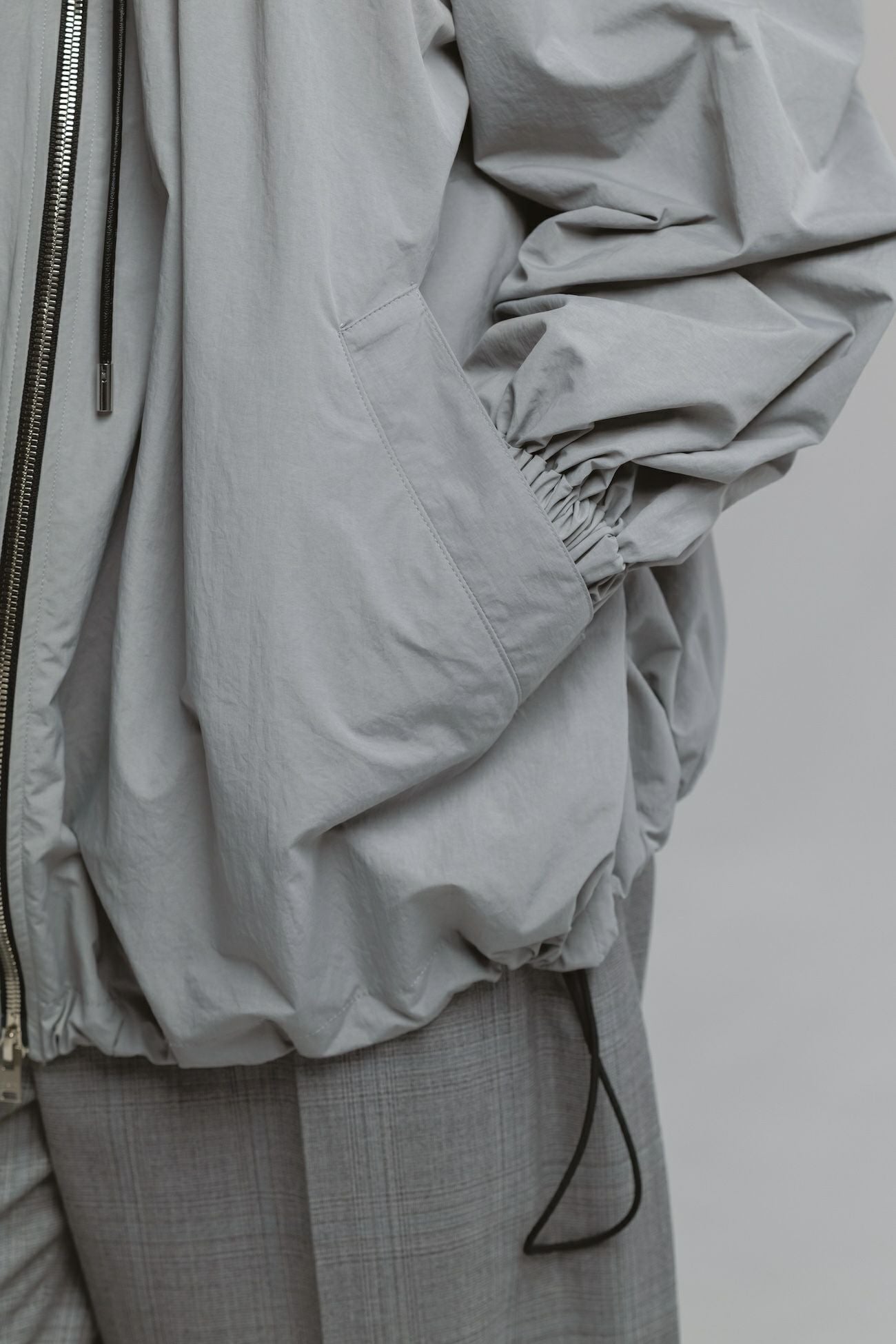 ・ボリューム感のあるシルエットのナイロンフーディブルゾン ・襟ぐりと裾にはドローコード付きでシルエット調整が可能 ・フロントのドローコードで生まれるドレープがエレガントな印象 ・フード口にはハリ感のあるディテールを加え、華やかさを演出 ・立体感ある襟元で、カジュアルと上品さを両立したデザイン