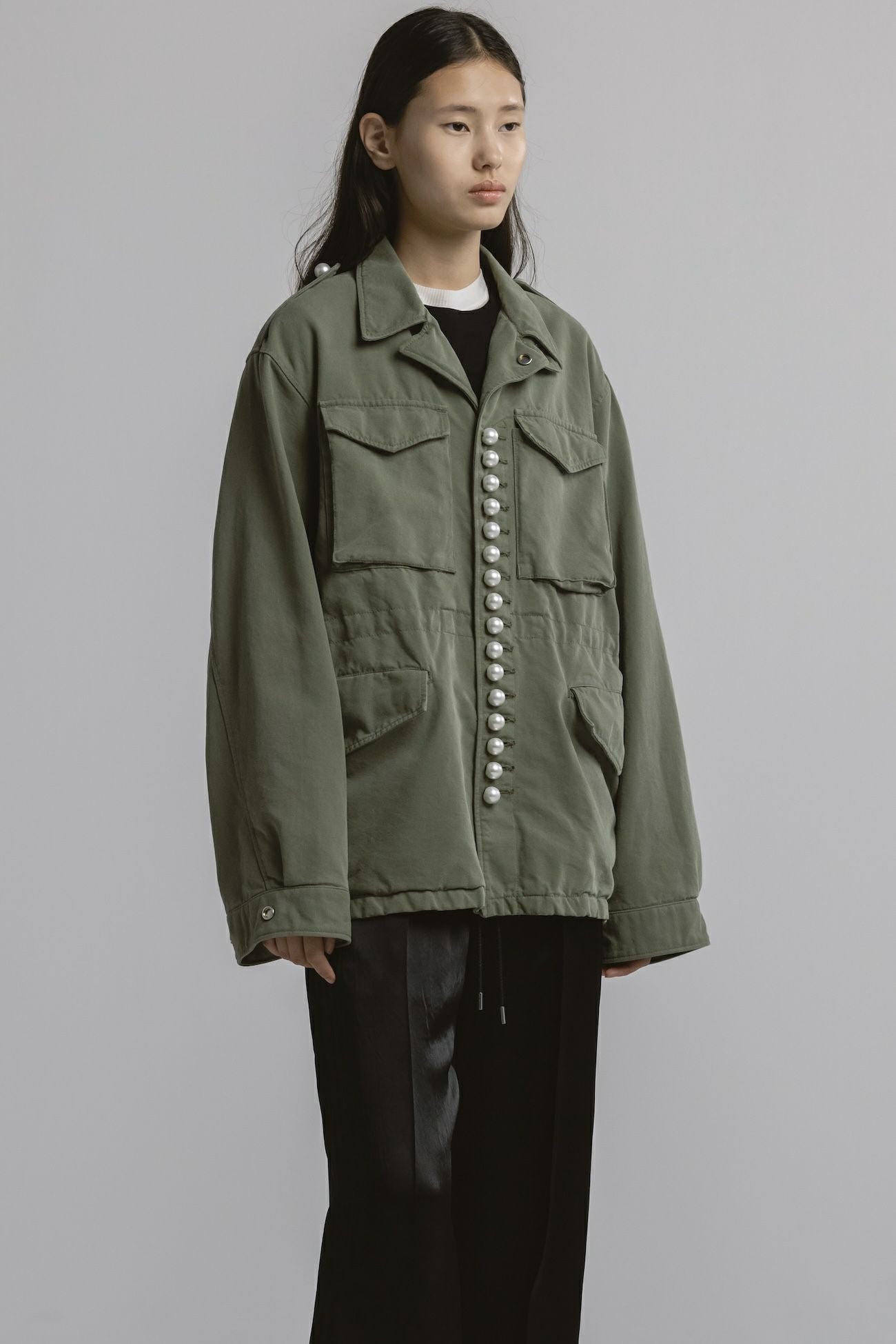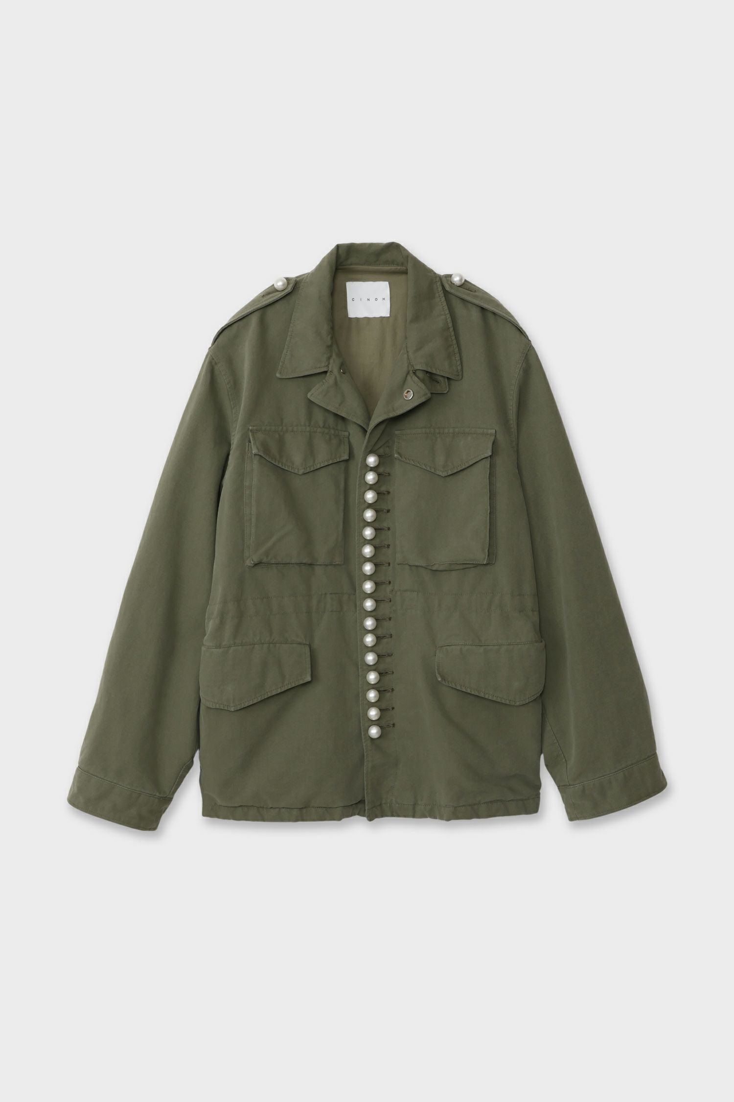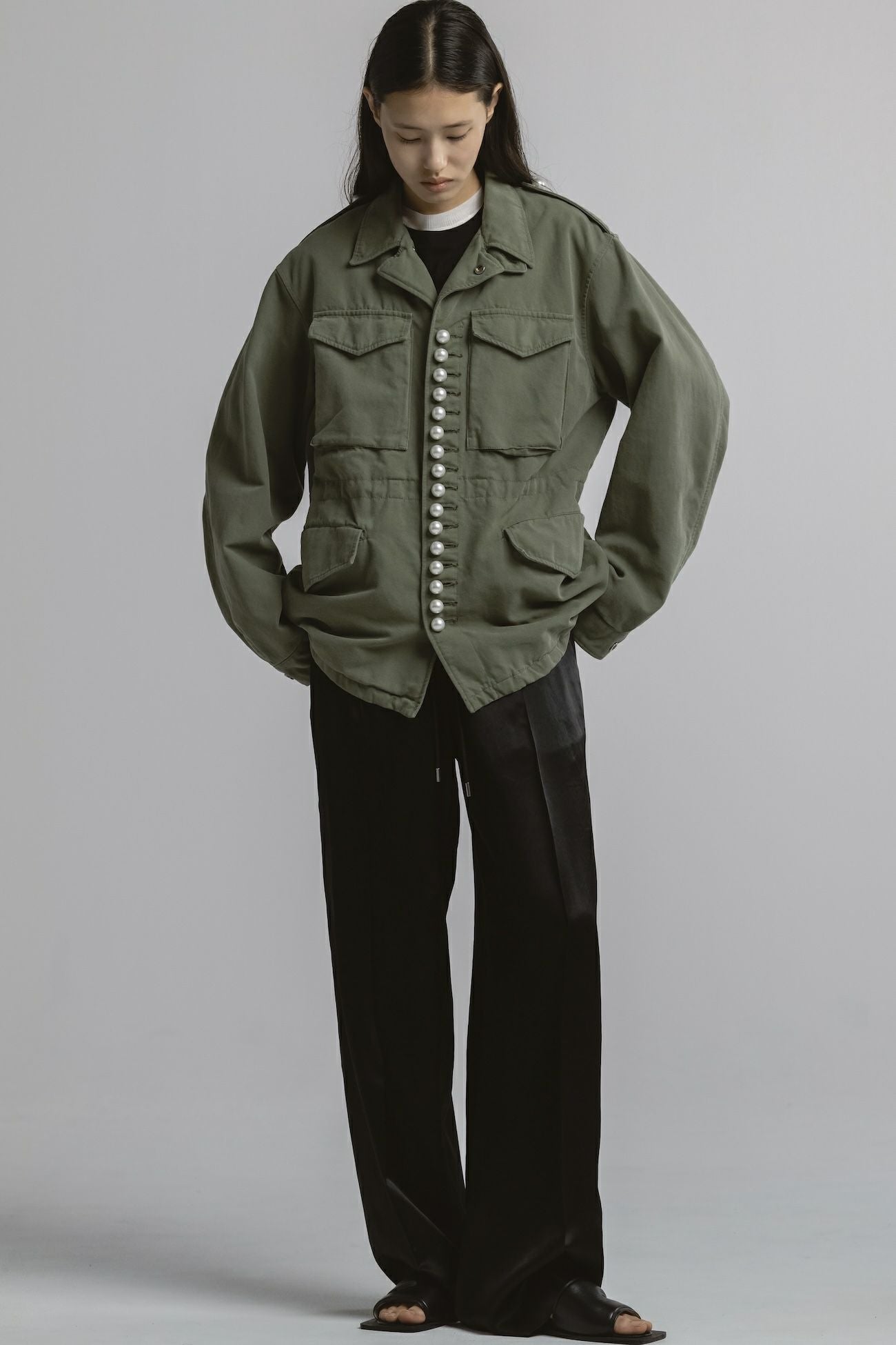 ・M-43ミリタリーフィールドジャケットをベースにした無骨なシルエット ・フロントには複数のパールボタンを配置し、ラギッドな印象と装飾性のコントラストを表現 ・オーセンティックなディテールに、フェミニンで上品なアクセントを加えた独自のバランス ・スタイリングに変化を加える1枚で、日常から特別なシーンまで幅広く活躍