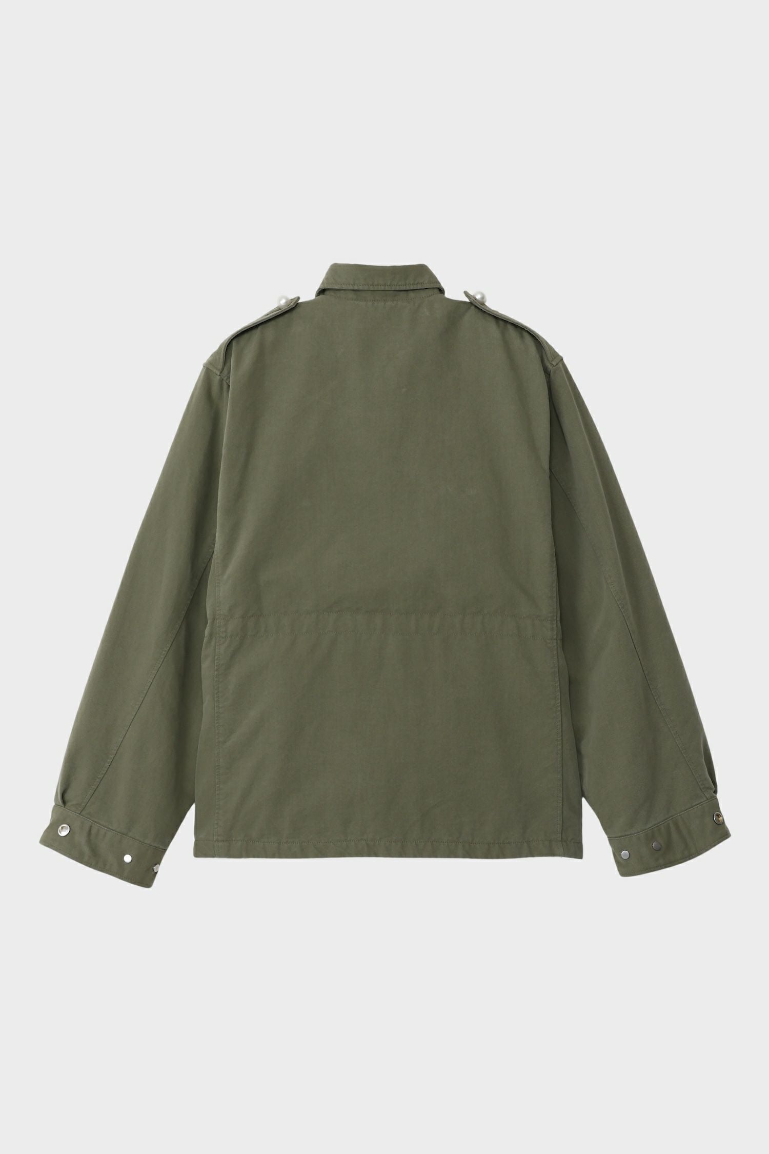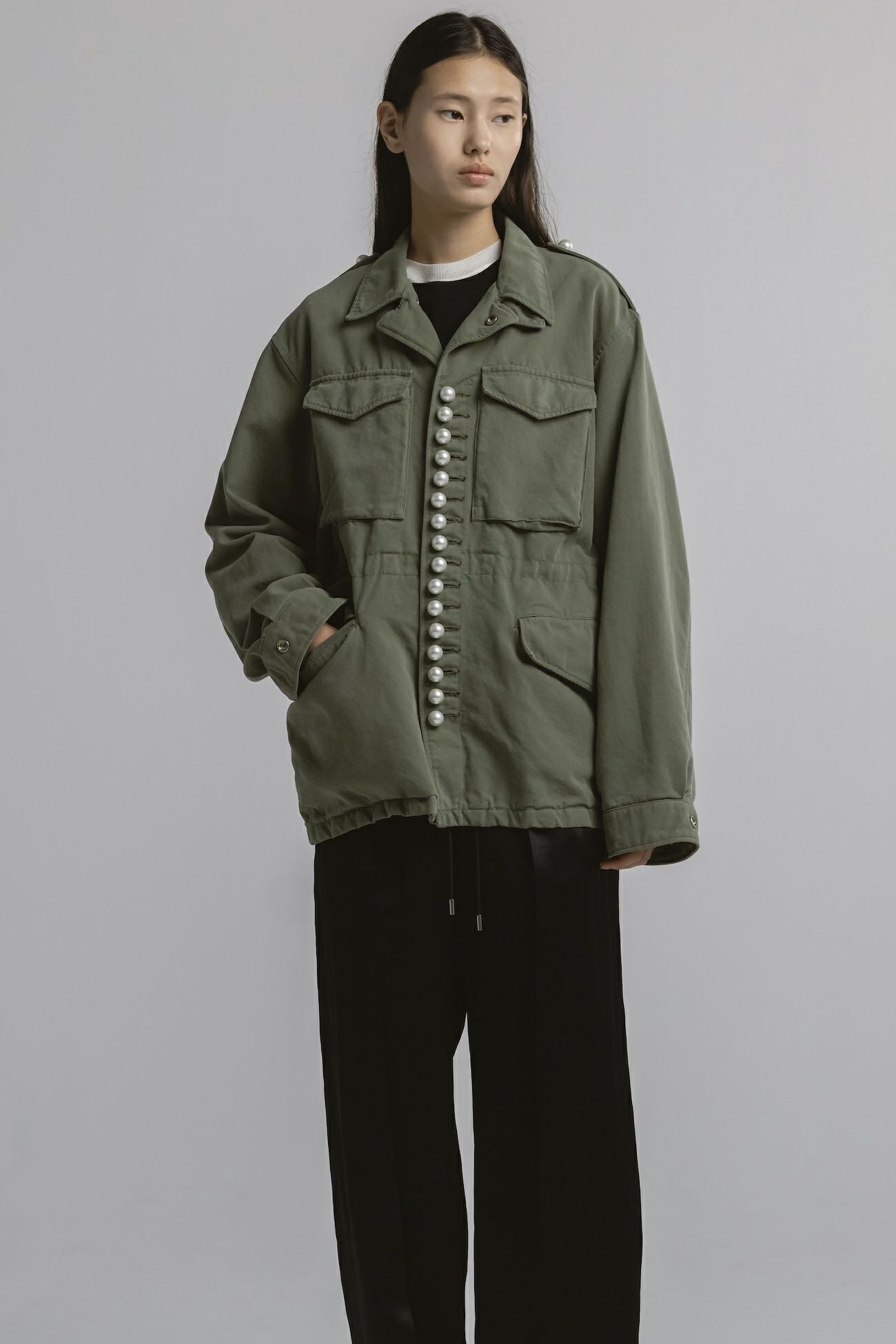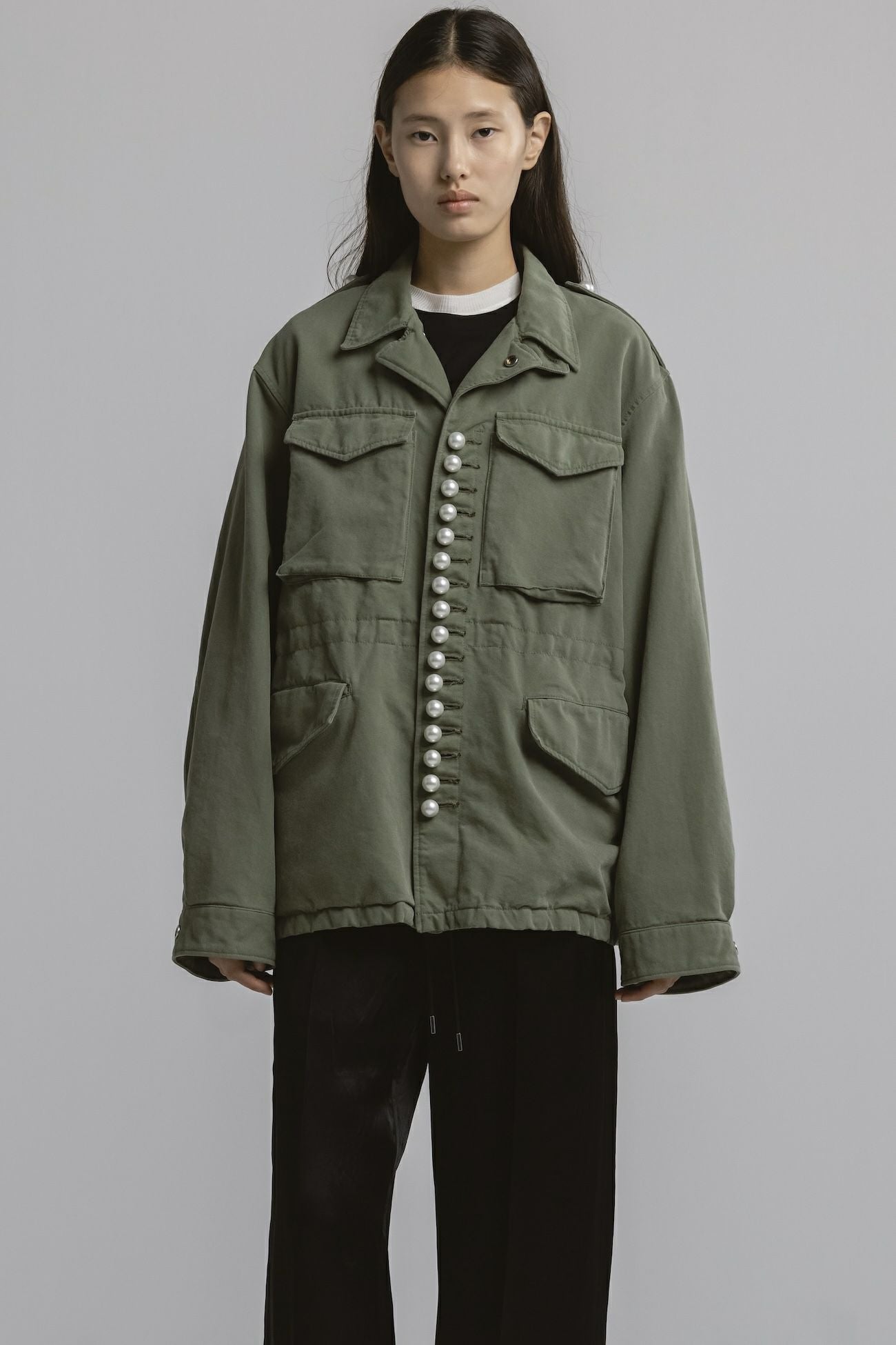 ・M-43ミリタリーフィールドジャケットをベースにした無骨なシルエット ・フロントには複数のパールボタンを配置し、ラギッドな印象と装飾性のコントラストを表現 ・オーセンティックなディテールに、フェミニンで上品なアクセントを加えた独自のバランス ・スタイリングに変化を加える1枚で、日常から特別なシーンまで幅広く活躍