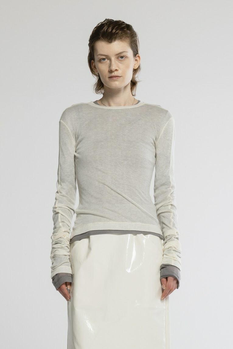 肌触りと透け感の特徴を活かしタイトトップスに仕上げています。