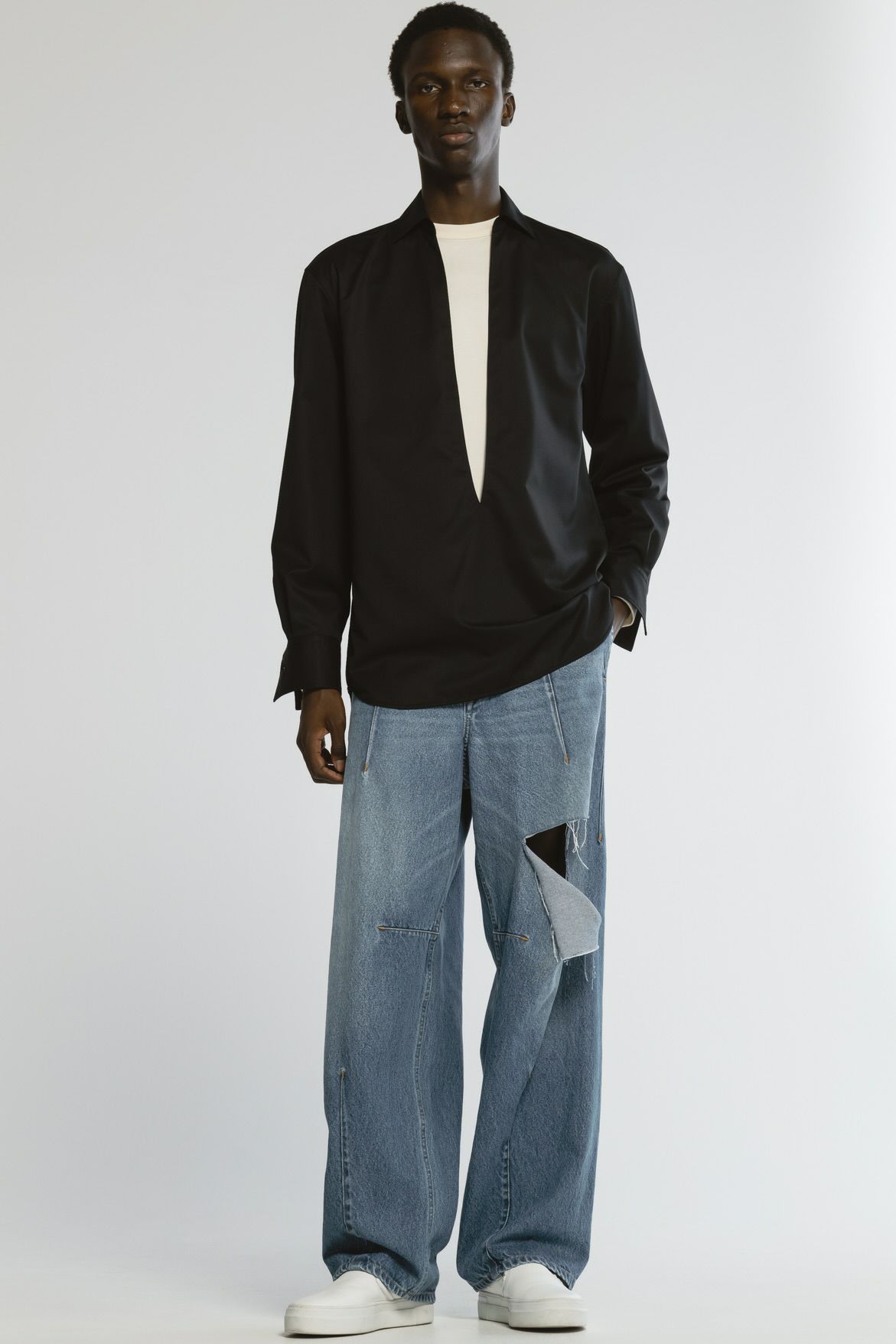 深Vディテールでミニマルな印象のリラックスフィットシャツ。