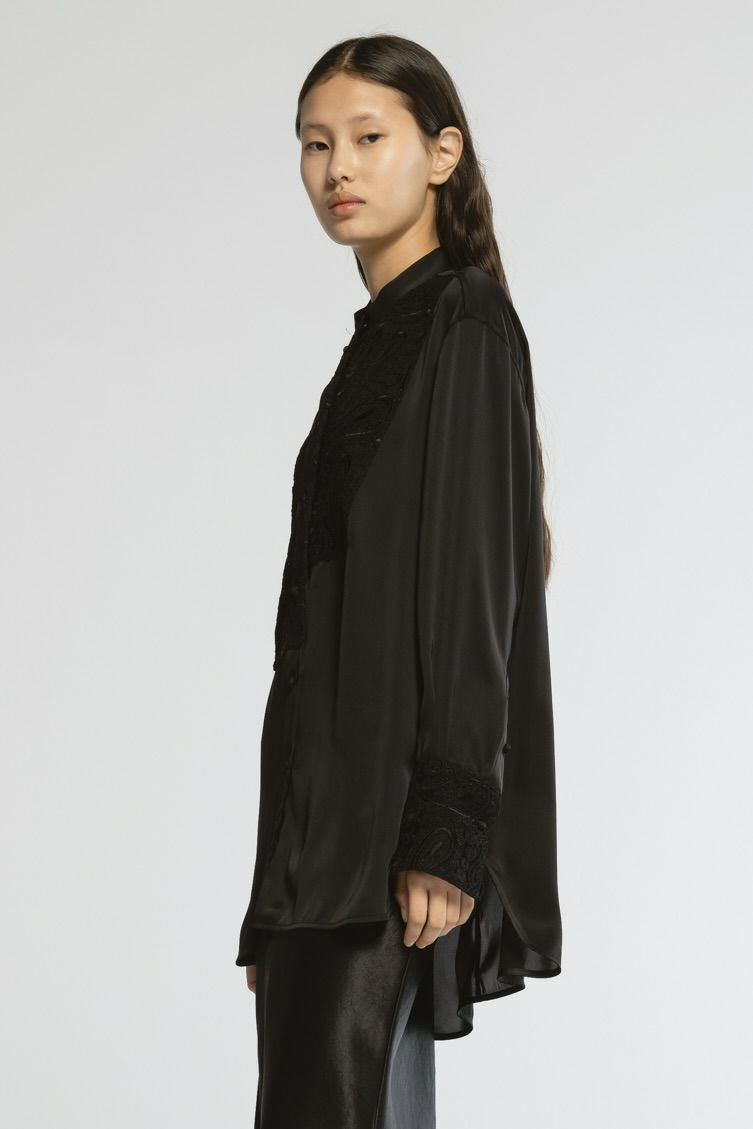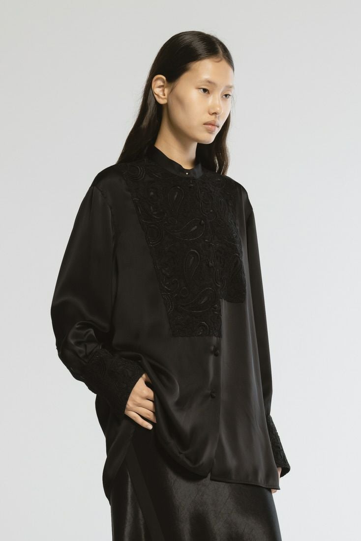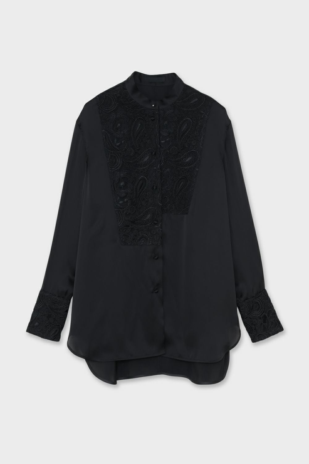 【レース部分】 やわらかなチュールにレーヨンのコード刺繍を施した、透け感とのコントラストが美しい素材。 コード刺繍ができる機械は日本に1台のみの希少な加工技術を施した素材です。 まずはベース刺繍を全体に施した後、熟練職人の技術で完璧な柄合わせをしコードを上から刺繍していくという、匠の技により美しく立体感のある刺繍が丁寧に施されています。