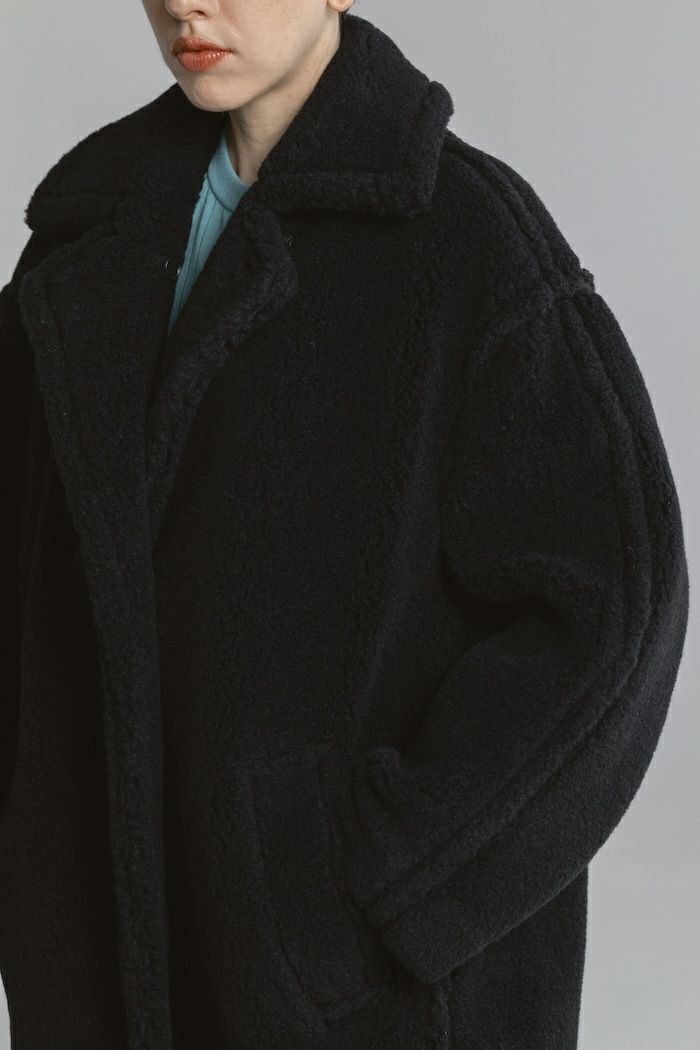 全体的にゆったりとしたシルエットのコートで、着方の好みに合わせてサイズ選びがしやすいアイテムです。ジャストサイズで着たい場合は36を、ラフに羽織りたい場合は38を選んでいます。見た目のボリュームに反して軽い着心地で、長時間の着用でもストレスを感じにくいのが魅力です。