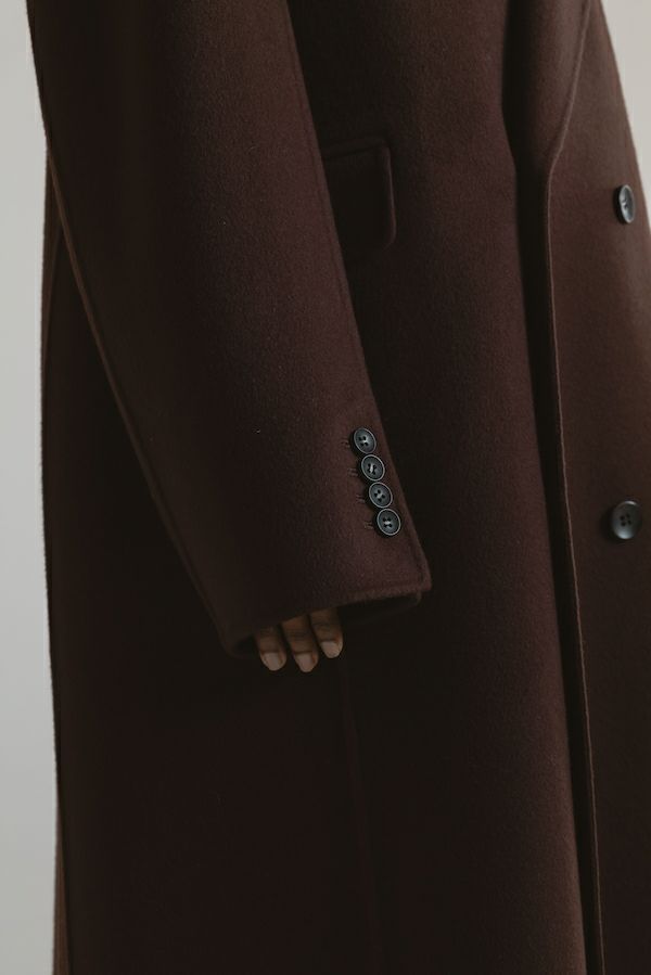 ・クラシックなダブルブレストデザイン ・素材の持つ上品さを活かしたミニマルな仕上がり ・軽やかな着心地ながらしっかりとした構築感を持ち、洗練されたシルエットに ・袖や身頃のラインにも立体感があり、着る人の佇まいを美しく引き立てます