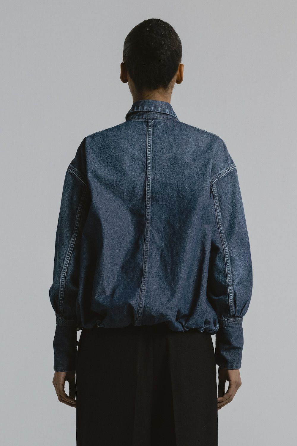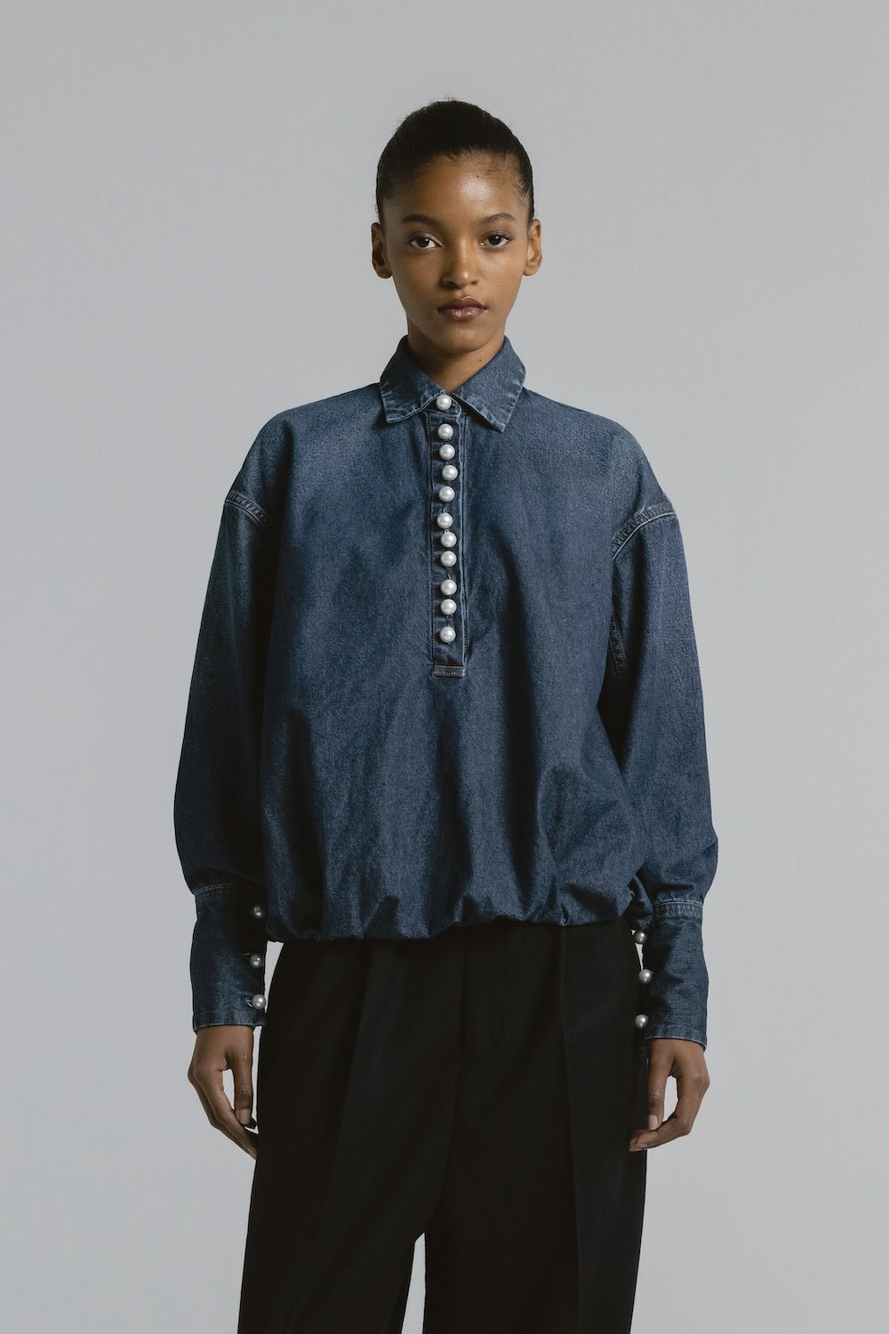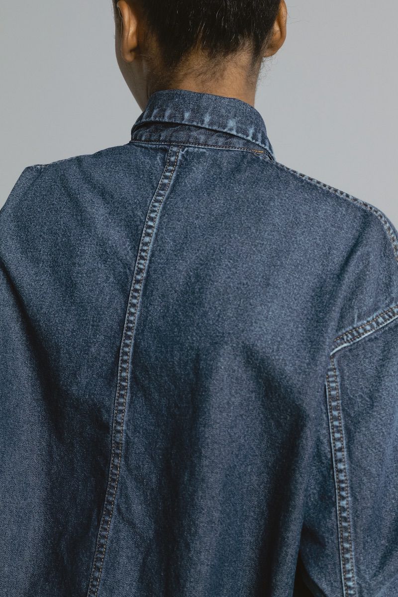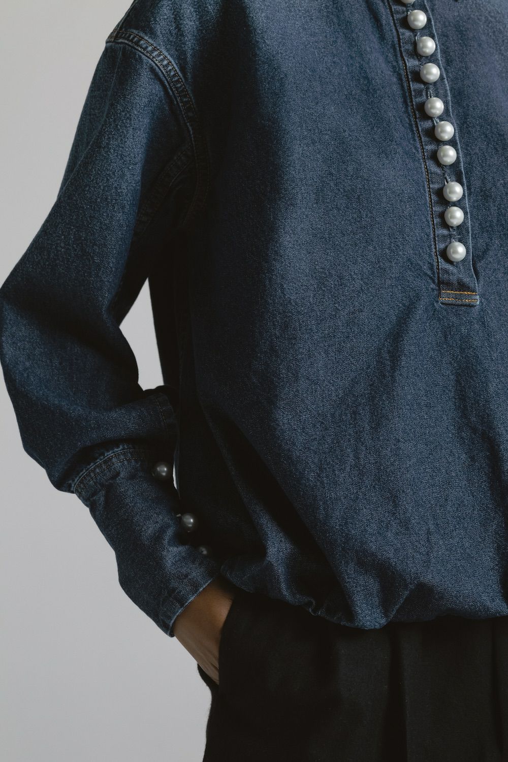 - ブラウジングパールボタンデニムシャツ[M.BLUE]