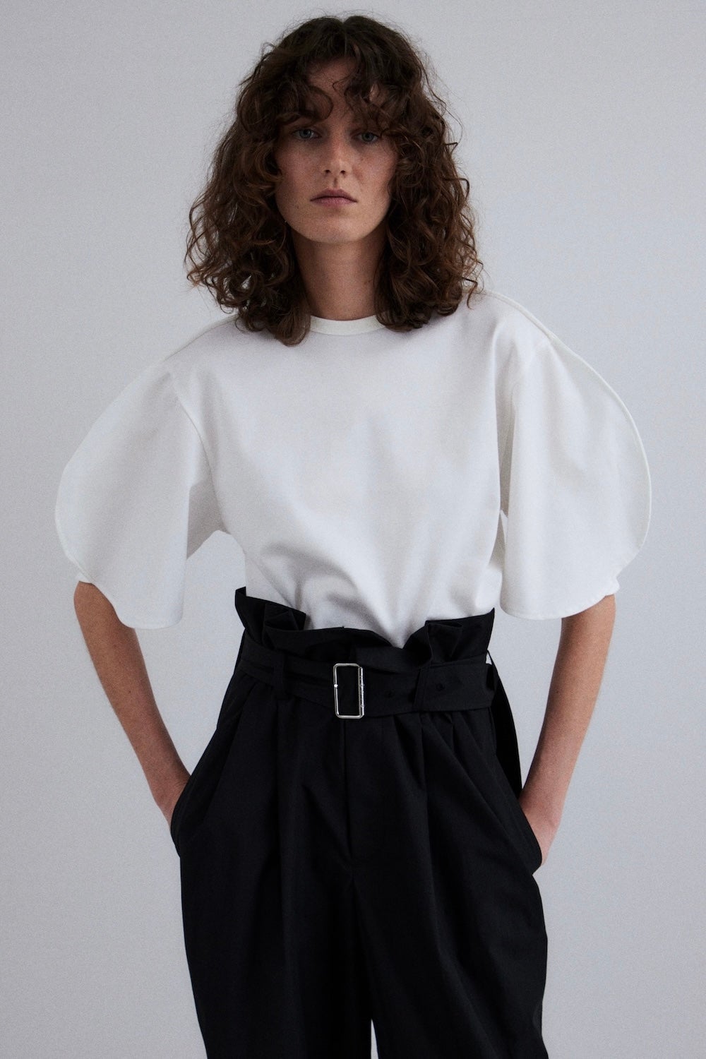 ・丸みのあるパターンで構築された袖が、前後に自然に倒れ込む動きの中でニュアンスを生み出す設計