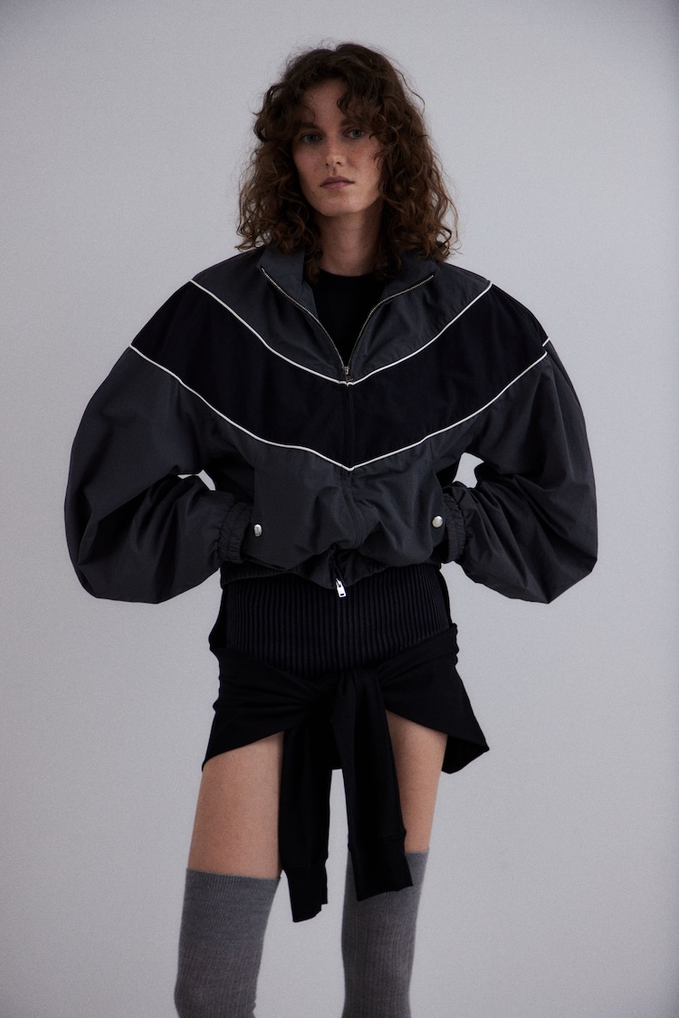 ウィメンズでは、円を模したパターンを起点としながらも、その円が“崩れる”瞬間に現れるラインや、運動の中で生まれる綻び、ゆらぎをディテールへと落とし込んでいます。