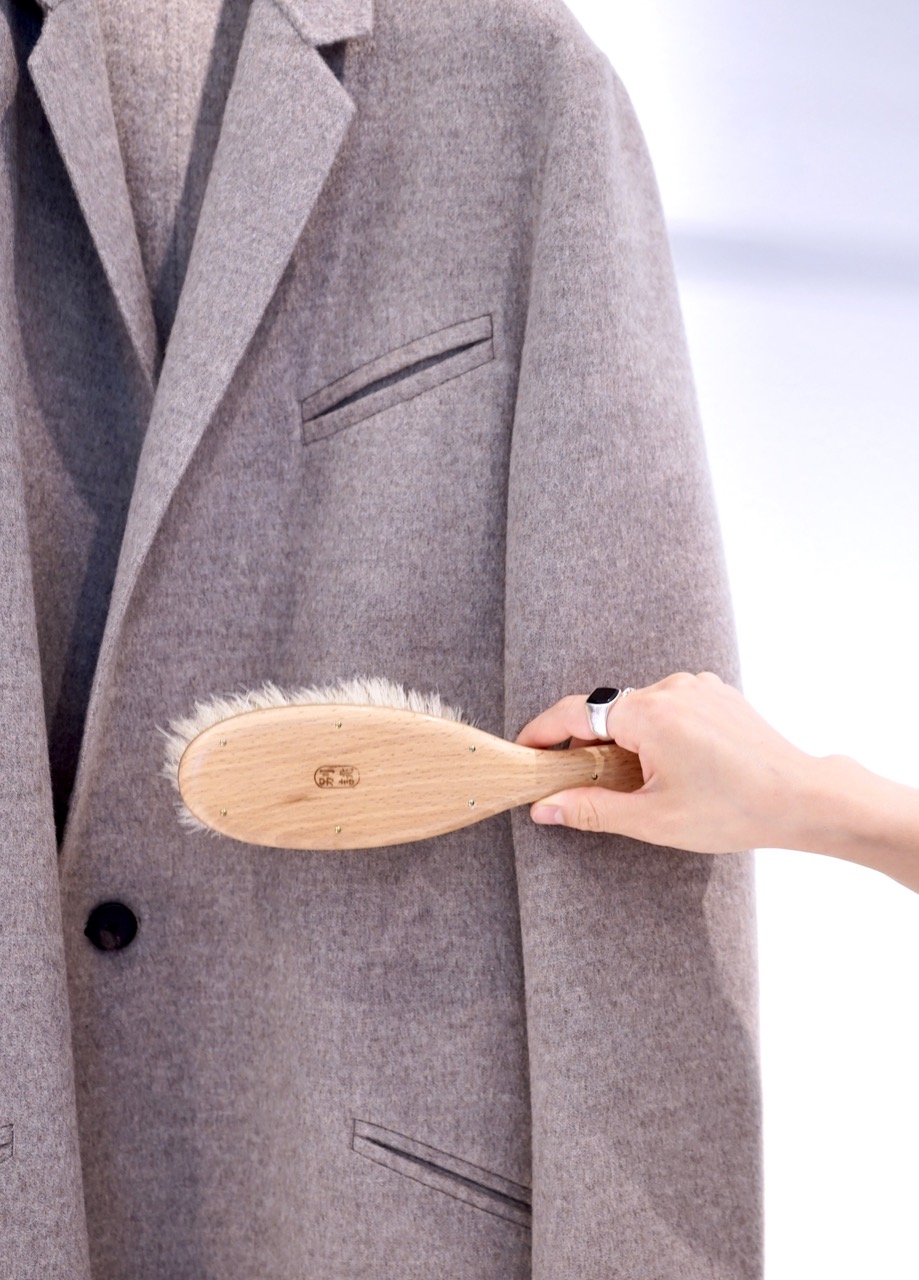 着用後は必ずブラッシングするように心がけましょう。ブラッシングで絡まった繊維をほぐすと、毛玉の発生を防げます。 - ブラシは静電気が起こりにくい天然素材(動物の毛)のものをおすすめします。